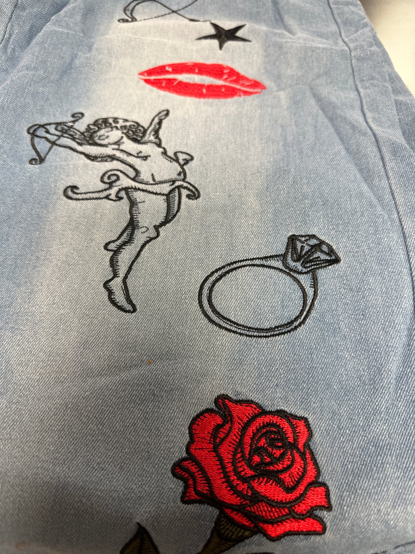 These embroidered high waisted jeans have a light wash. The black and red embroidery down each leg create a rebellious vibe. The back waist band is elastic to aid in a perfect fit. These wide leg pants are available in S-M-L.