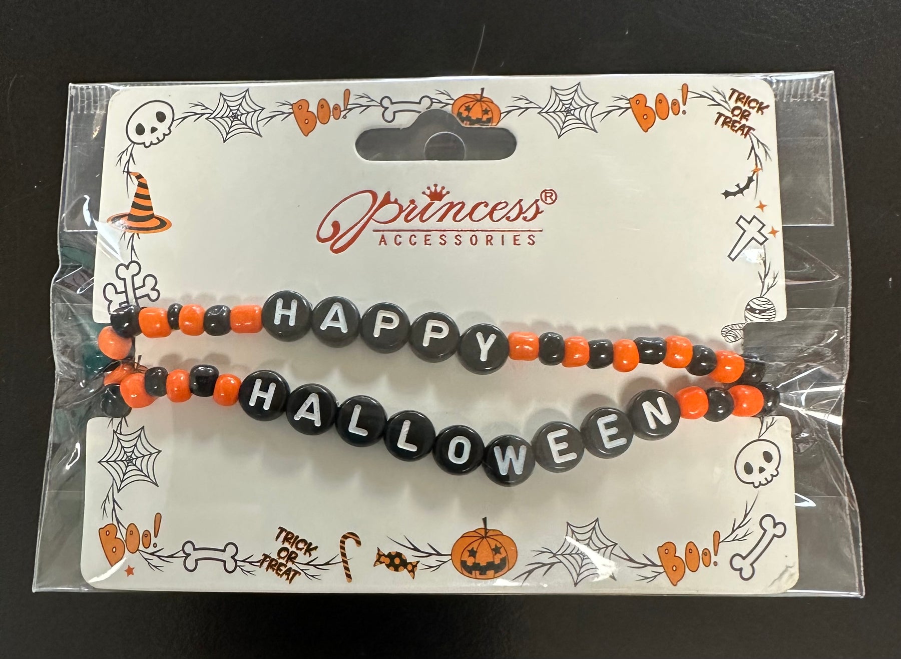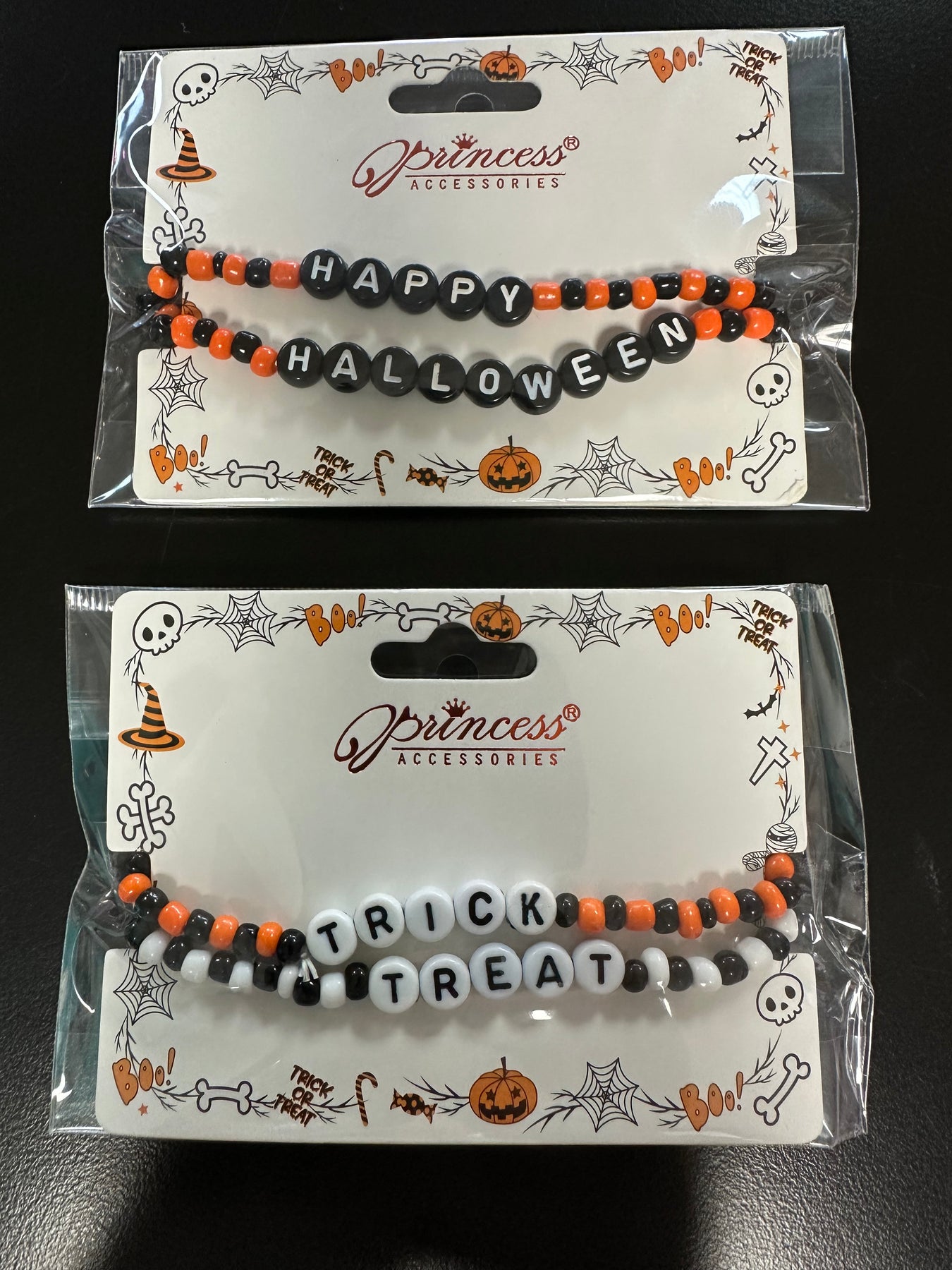These stretchy beaded elastic bracelets say Happy Halloween or Trick or Treat.  The beads are alternation orange and black or black & White.  Perfect to stack with other bracelets for the Spooky season! There are two bracelets in each package.