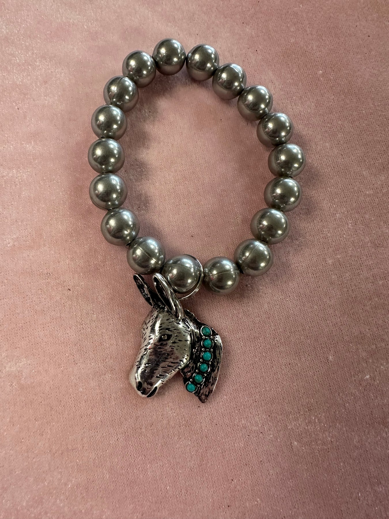 These silver beaded bracelets are elastic and will fit most wrists. There is a silver metal pendant charm that adds a western flare to the bracelet. We have a tooled heart, a barrel racer or a Mule/donkey.