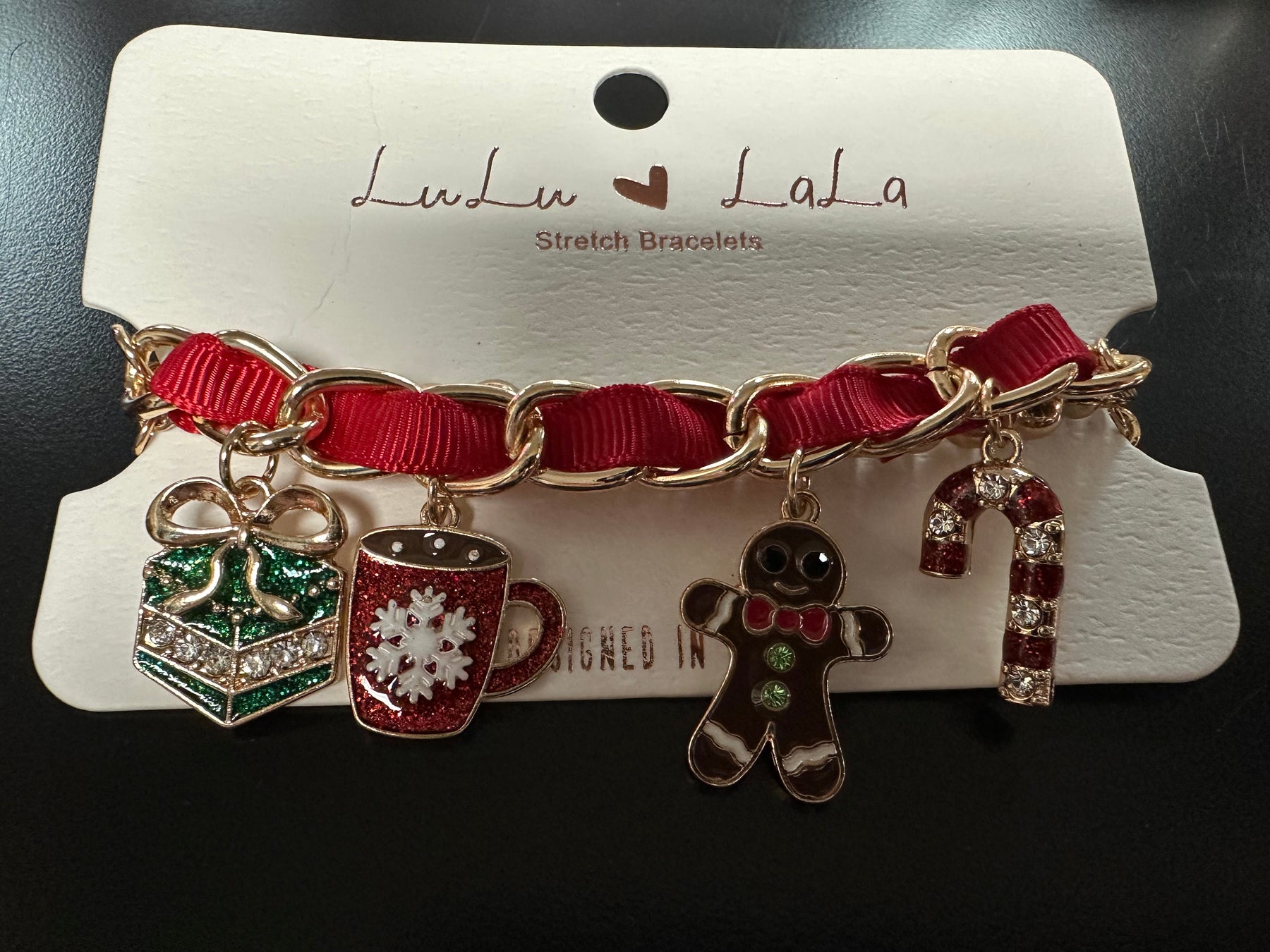 Double beaded golden beads with chain link and threaded ribbons and 4 enameled Christmas charms make this double bracelet so much fun. There are two designs available. One is a gingerbread and cocci theme and the other is a Santa and stocking theme.