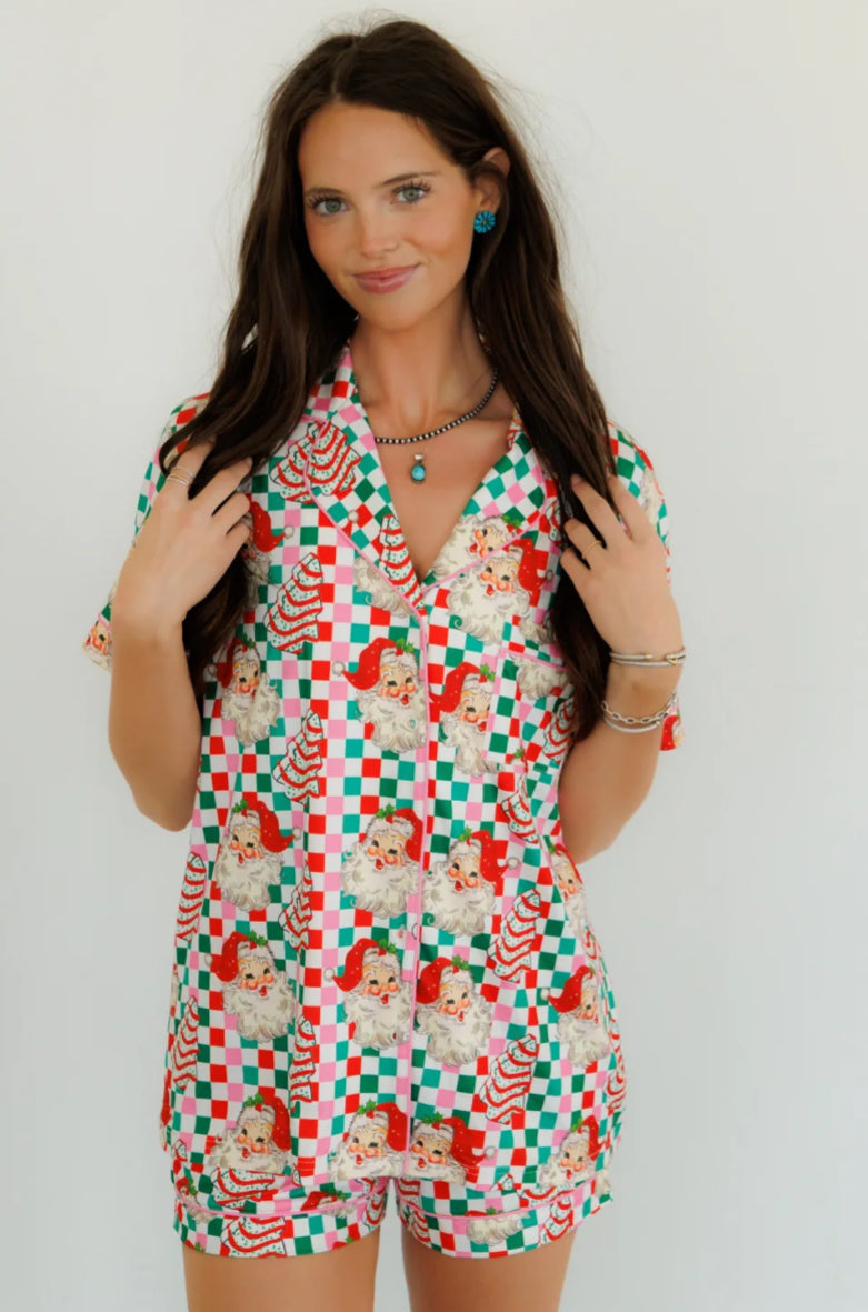 Checkerboard print with your favorite snack cakes and Santa! What could be better. Oh did we mention that these pjs are super soft and cozy? true to size stretchy fit.