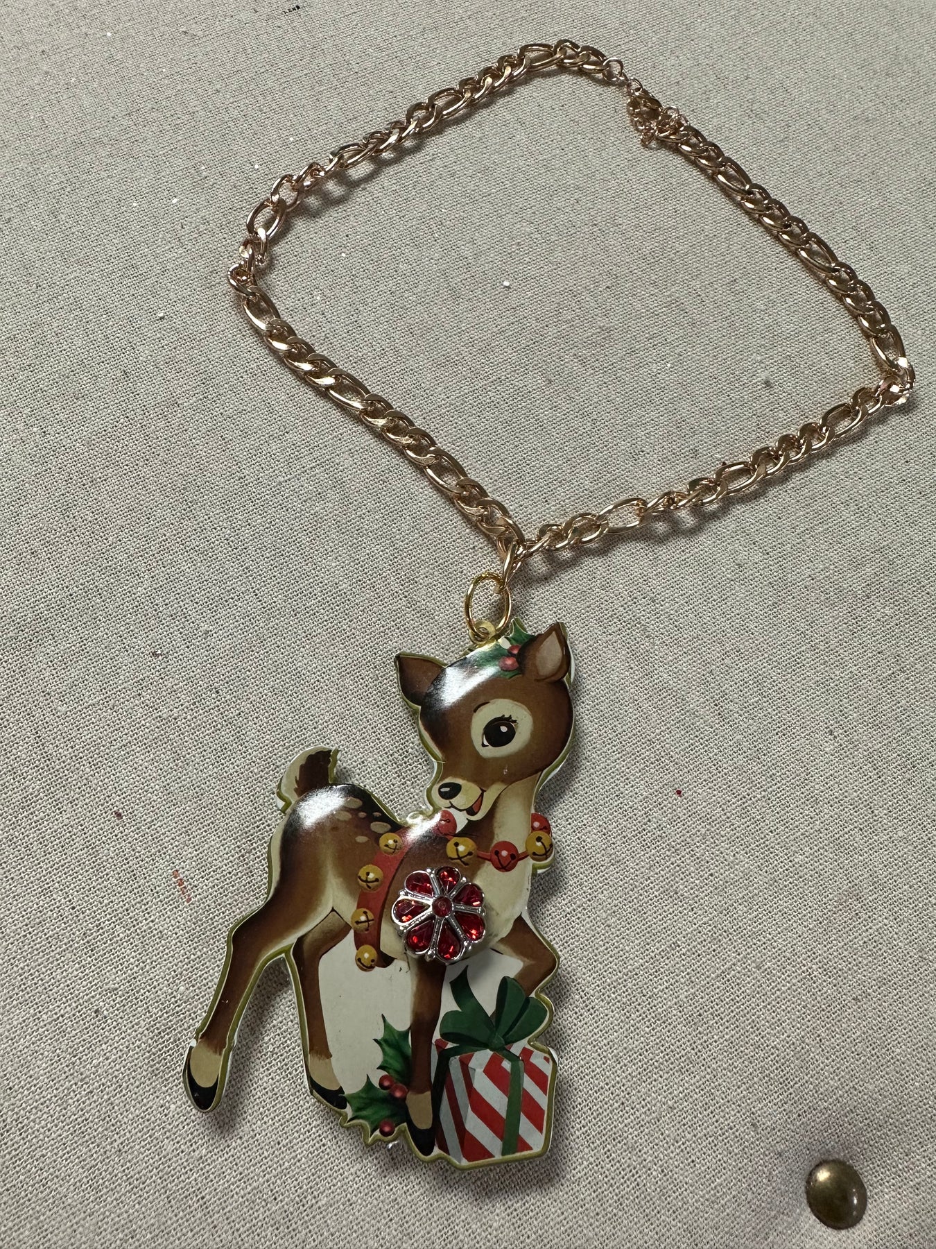 These Tin statement necklaces hang from a gold tone link chain.  The tin has a big rhinestone added to the design.  The tin is 5” long.  We have them available as a Santa, Snowman and Reindeer.