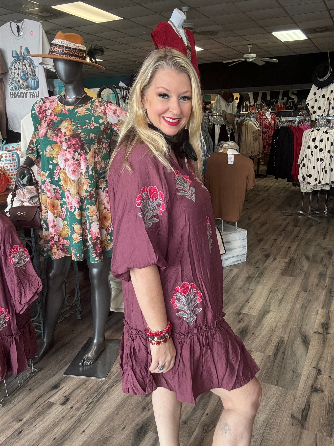 This plum poly blend feels like silk. It has the famous Umgee fit. The balloon sleeves come just above the elbows. There is a self cuff. The V neck has a collar. The deep ruffle hem adds extra flounce. The dress hem is above the knee. There is embroidery flowers in rosy red with forest stems on the sleeves and front of the dress. The dress is available in S-M-L.