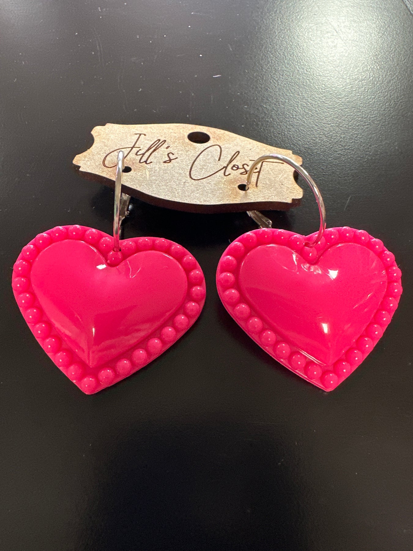 These very lightweight puffy hearts hang from a silver hoop. The hearts measure 2” across. We have pink or red.