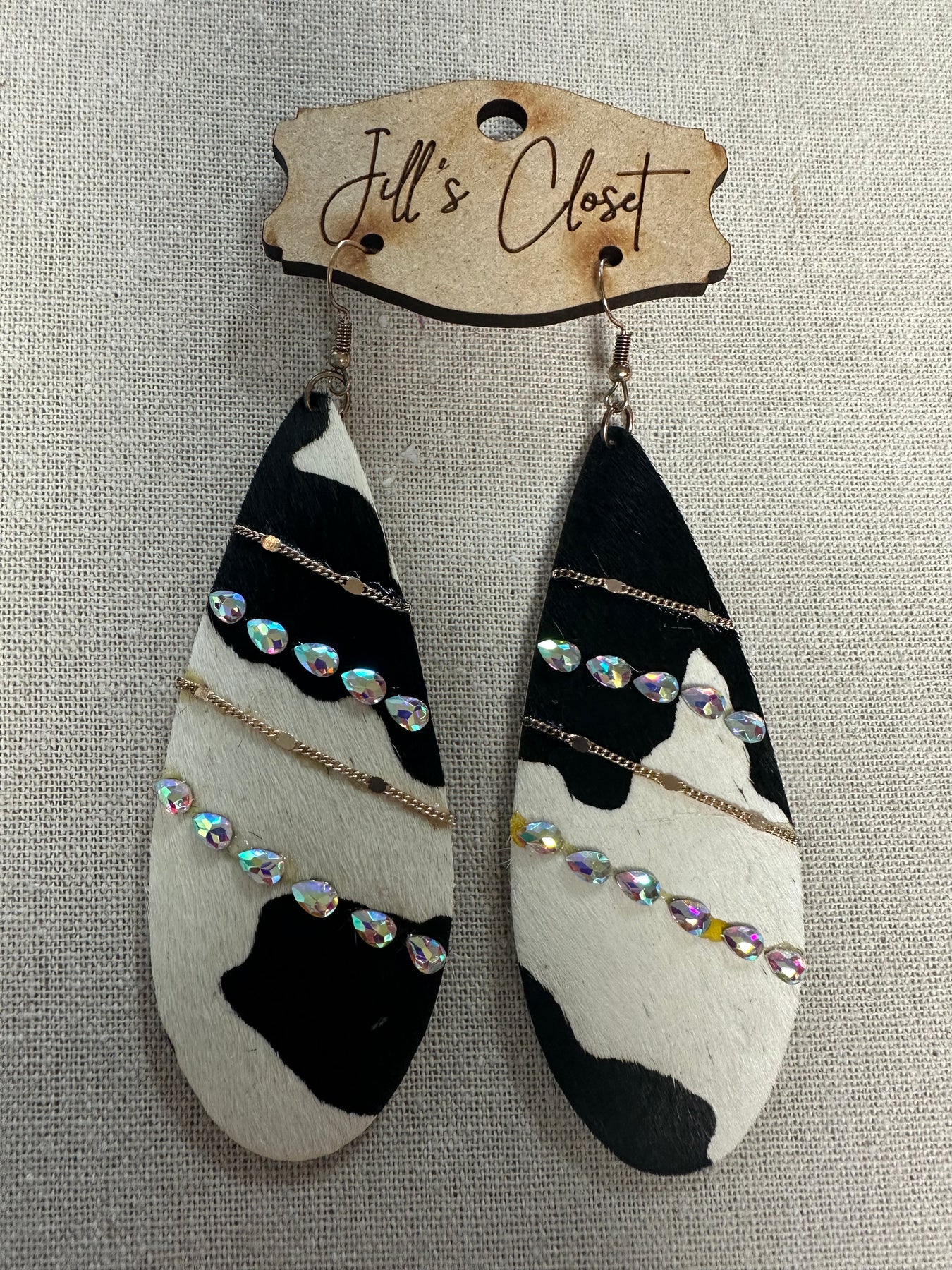 These large 4” long teardrops are out of natural hair on hide. Added to these are gold braids and rhinestones in a diagonal pattern. The teardrops hang from a golden fishhook. We have a black & white, a brown variegated and a pink to choose from.