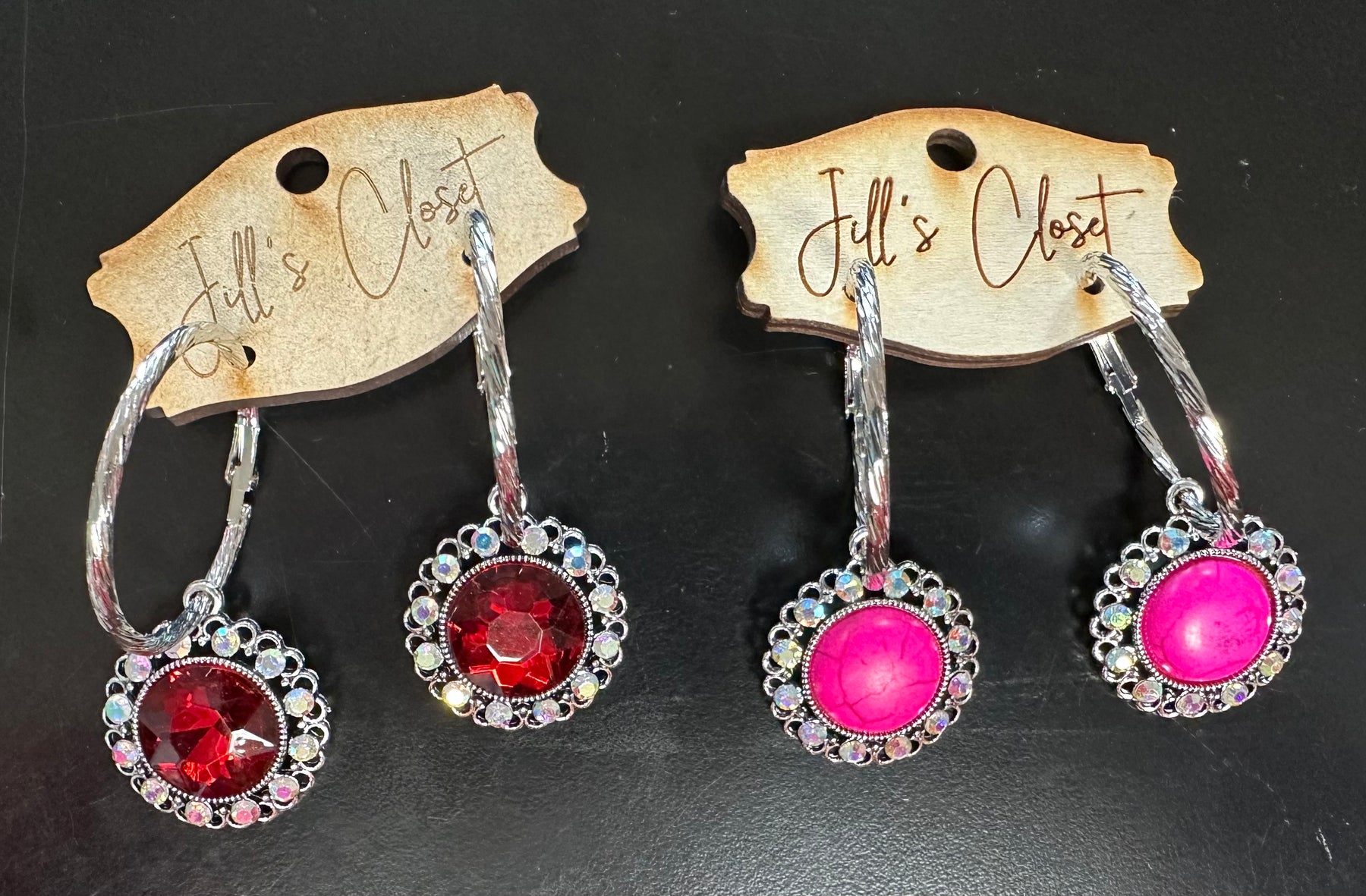 These large 1 1/2” silver toned hoops have a circle bling that is centered with a big stone. We have a bright red faceted stones around, or a pink faux turquoise type stone. The bling circle is 1 1/4” across.