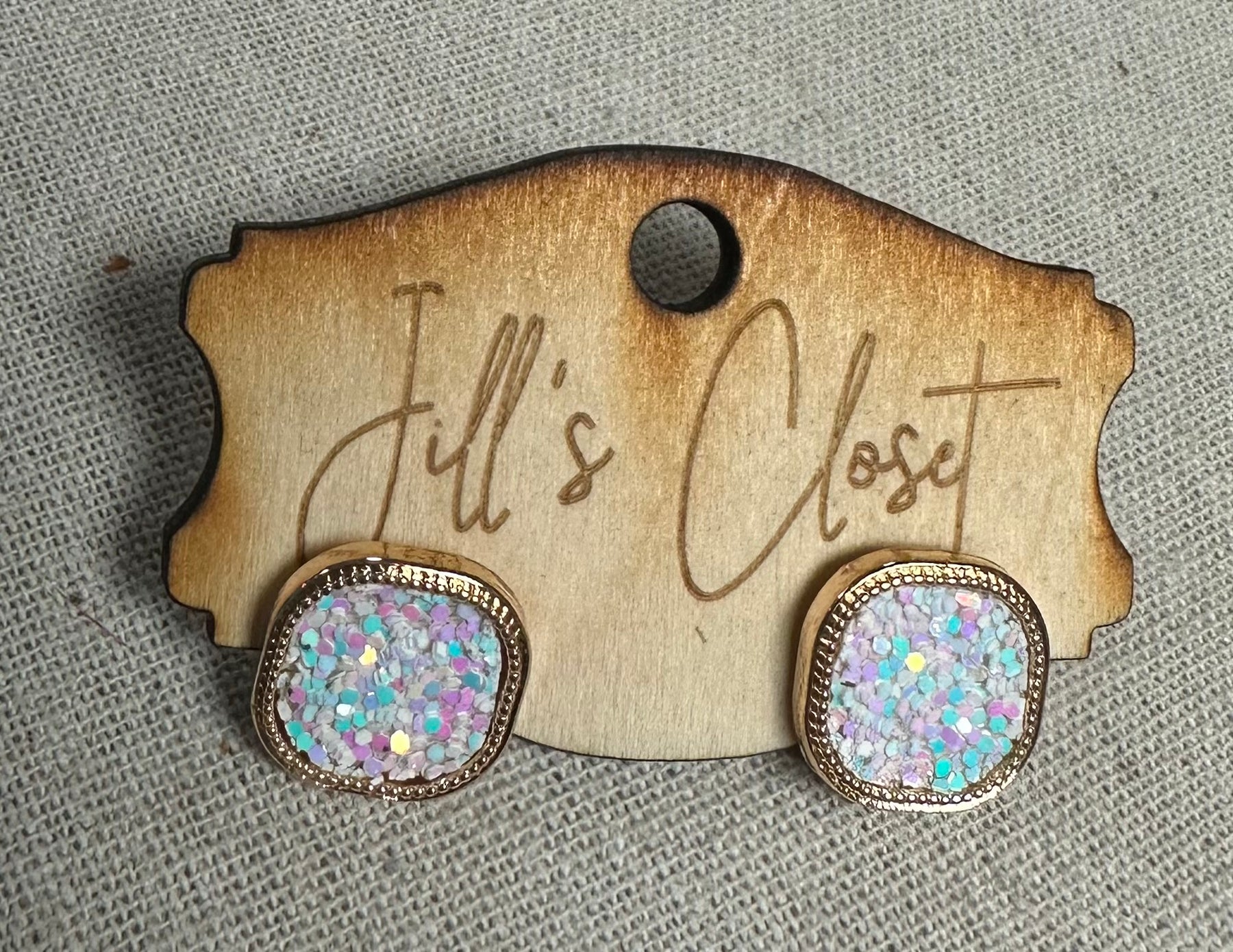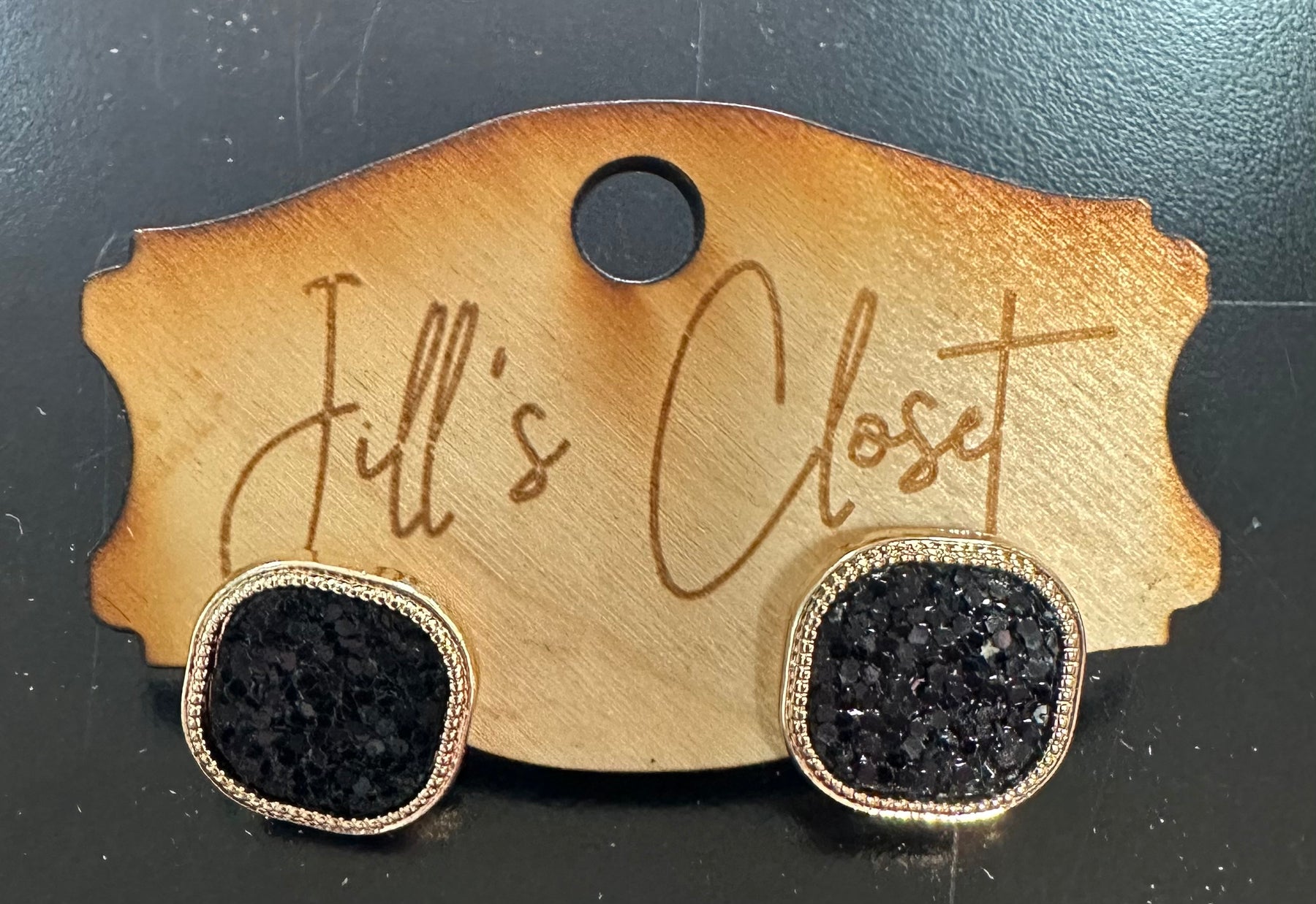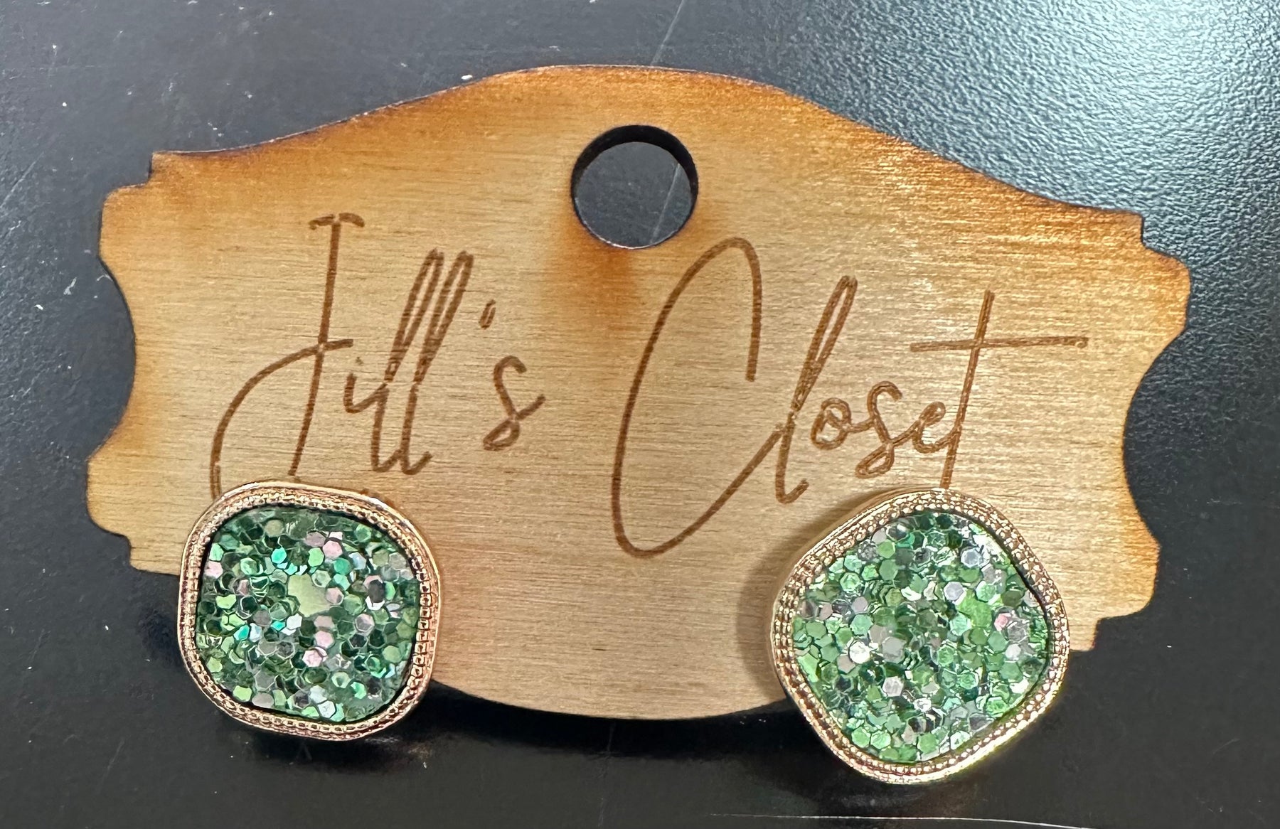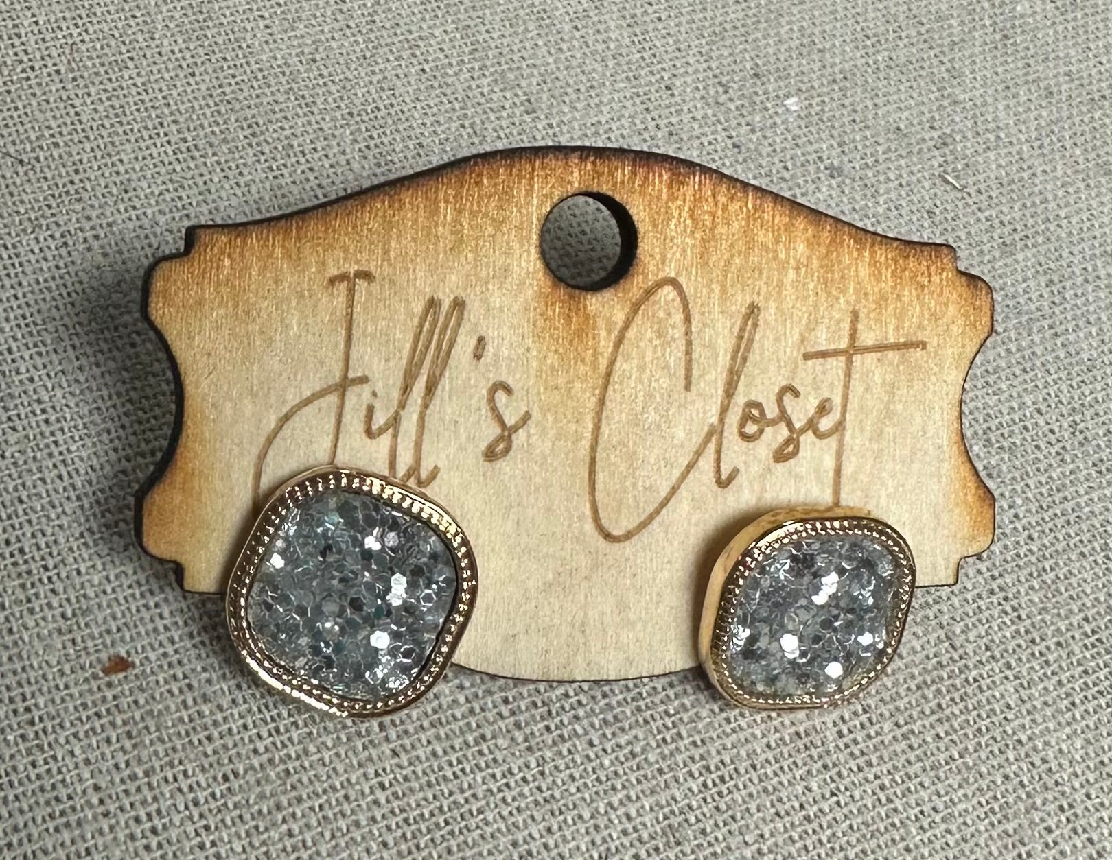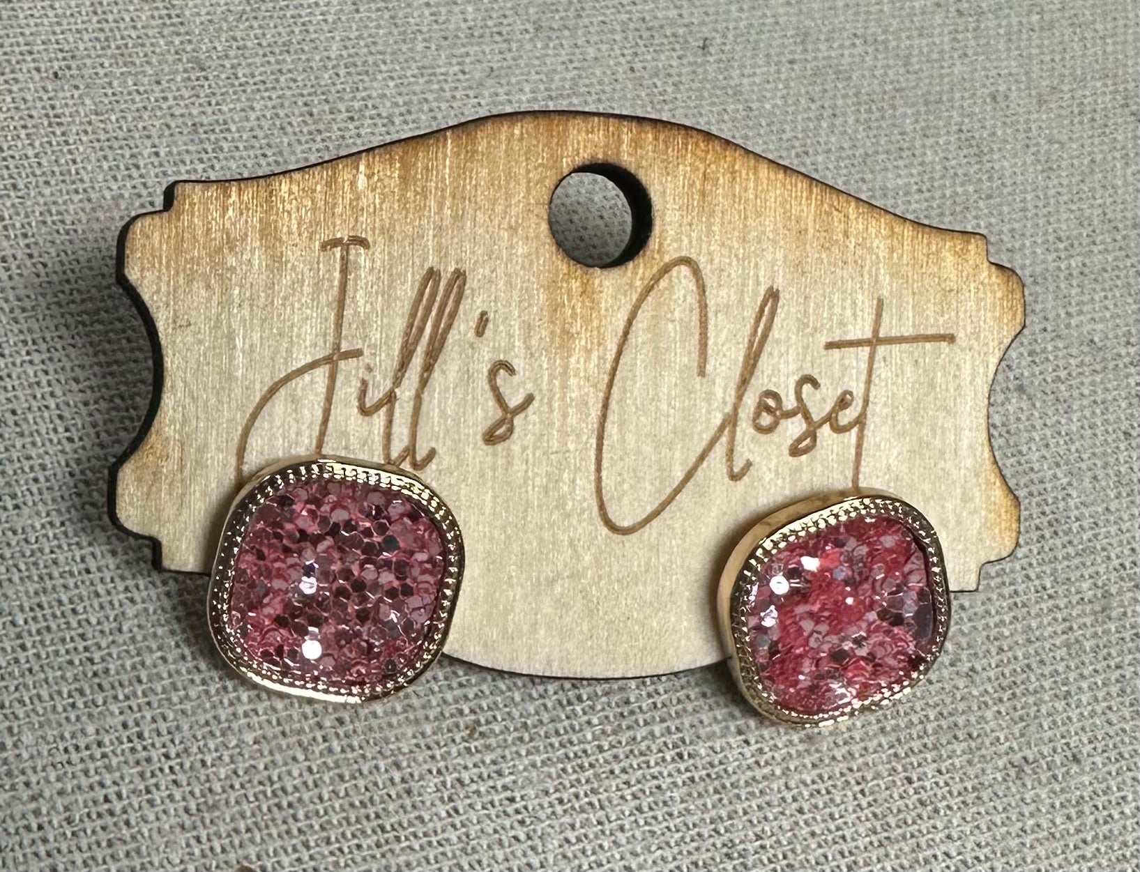 These gold toned metal bezel earrings have a curved square shape.  The square is filled with glitter in colors of red, orange, blue, black gold or green.  These stud earrings measure 5/8” square.