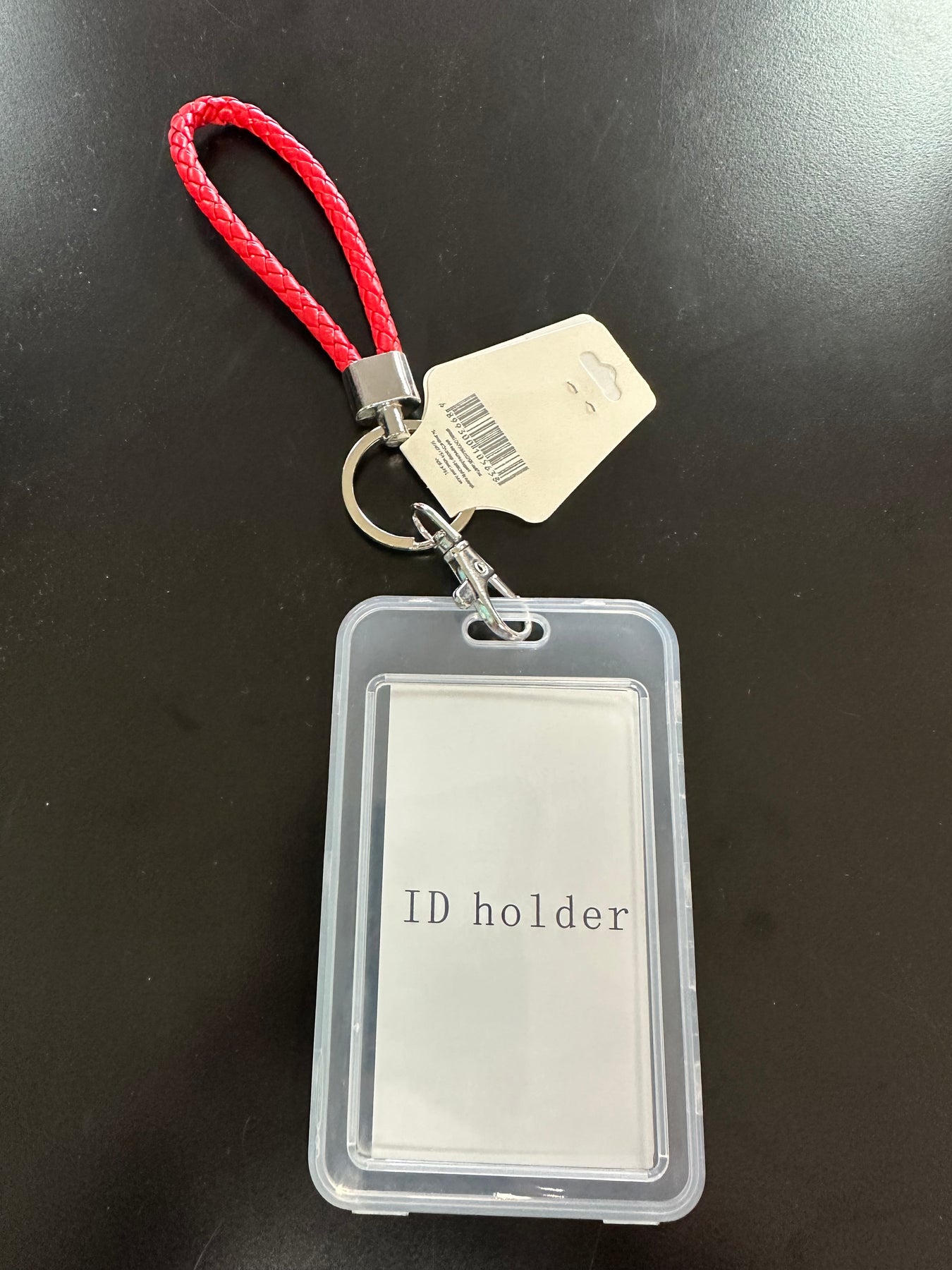 These plastic ID Holder has a braided wrist strap attached to the key ring. The colors of strap available are Black, white, red, gold and black & white.