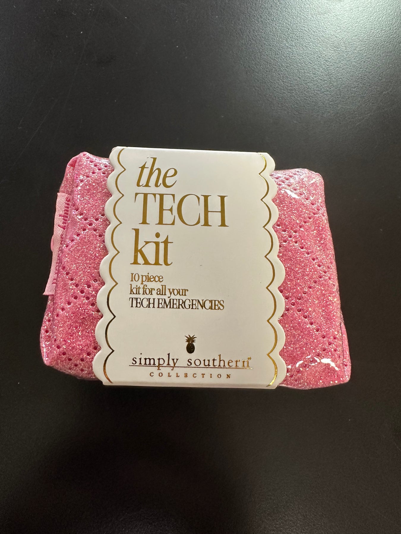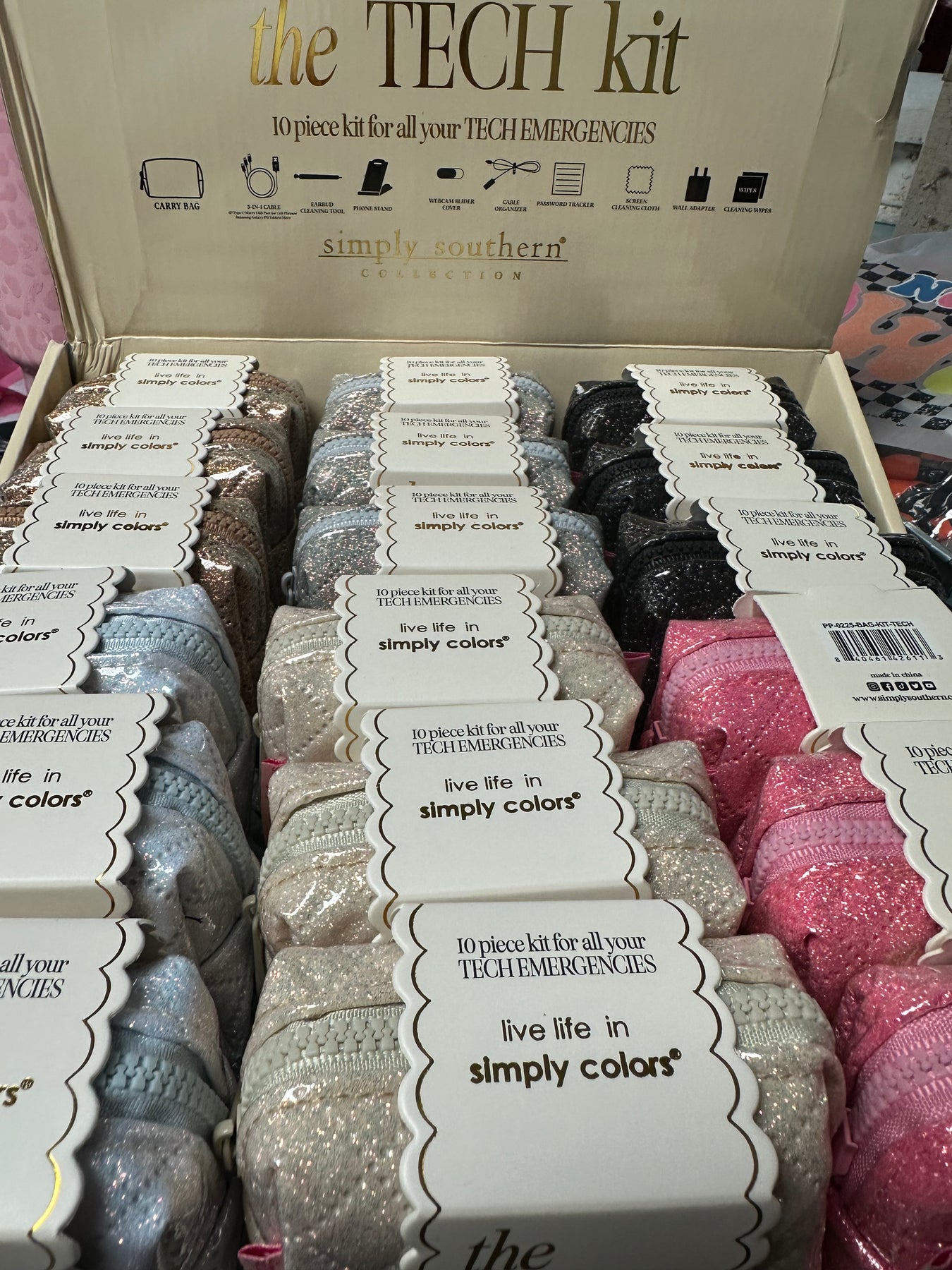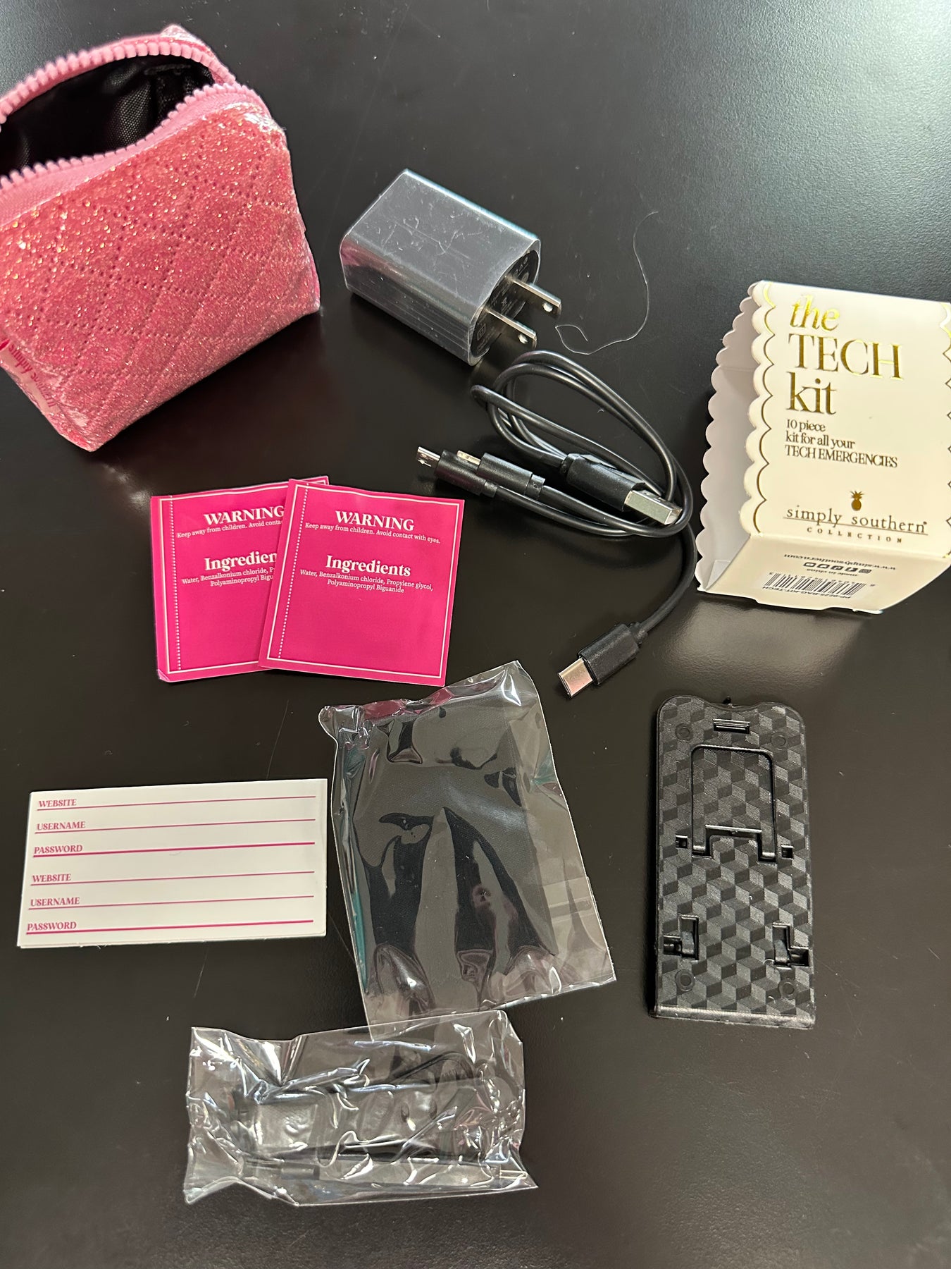 A 10 piece Tech kit for all your Tech emergencies. The small zipped case contains a 3 in 1 charging cable, ear bud cleaning tool, phone stand, webcam slider cover, cable organizer, password tracker, screen cleaning cloth, wall box adapter and 2 cleaning wipes. We have the bag in several colors.