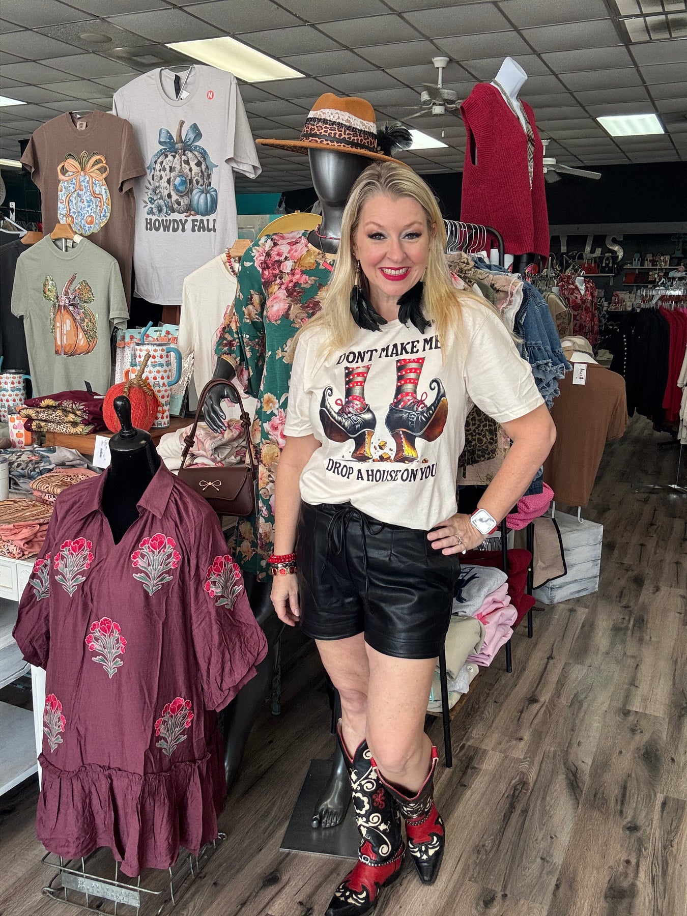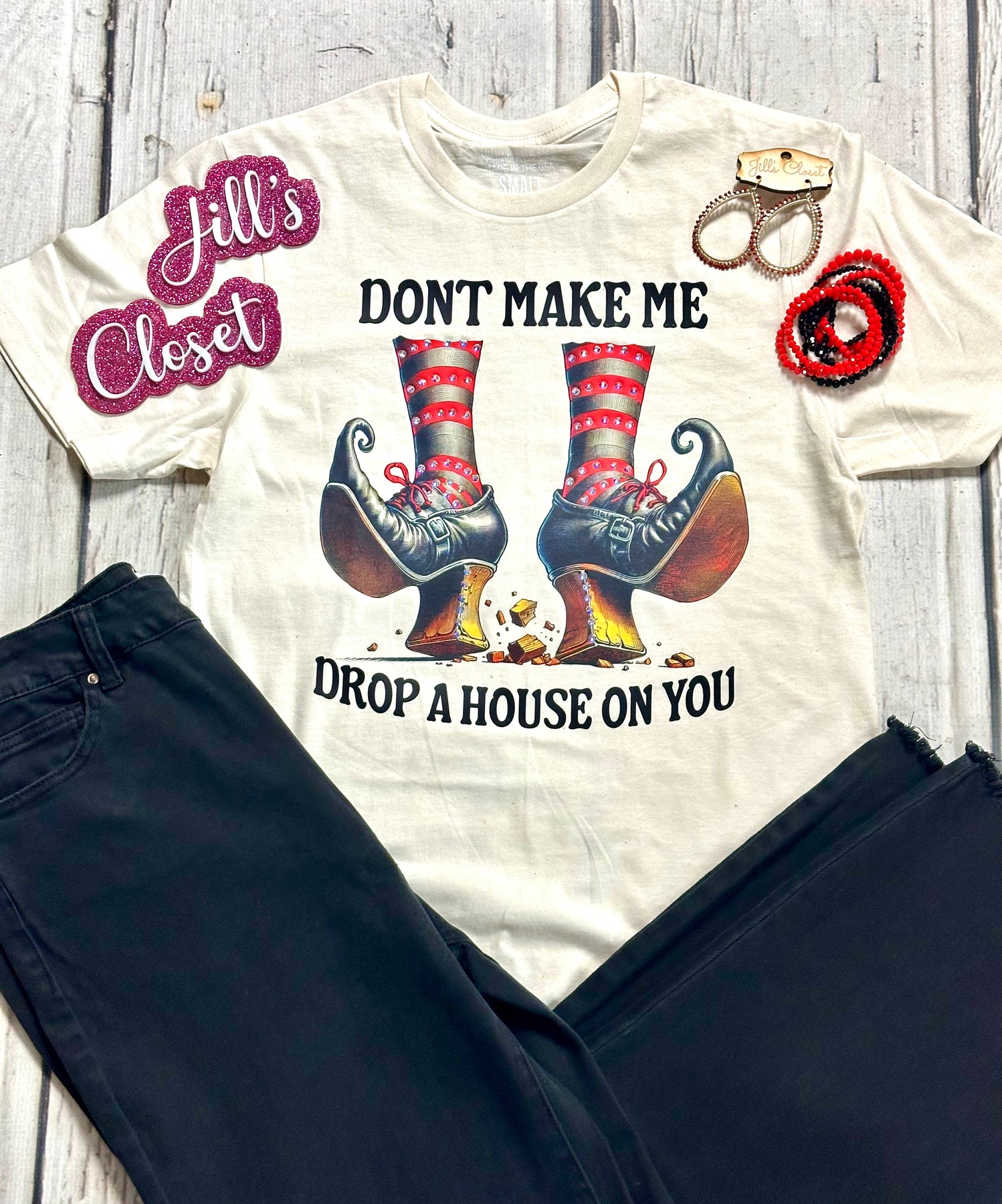 Don’t make me drop a House on you, Graphic Tee, sparkle, heels introducing the "Don’t Make Me" Graphic Tee, perfect for those who love a little attitude in their wardrobe. Made with sparkling fabric and paired with stylish heels, this shirt is sure to make a statement. Warning: "Don’t make me Drop a House on you!"
