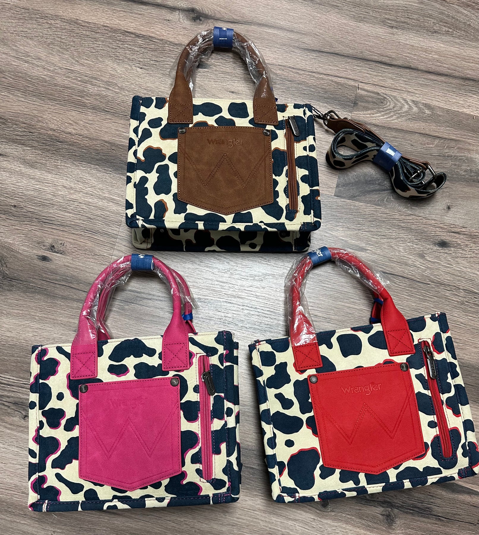 This faux leather animal print is accented with bright colors.  The bag is so versatile with a double handle and also a canvas shoulder strap. There is a side zipper for concealed carry and the Wrangler logo patch pocket on the outside. Inside there is a center zip pocket, and an open pocket as well.  This great bag is available in Hit Pink, Red and Brown.  It measures 10 1/2” wide x 8 1/2” tall x 4” wide.