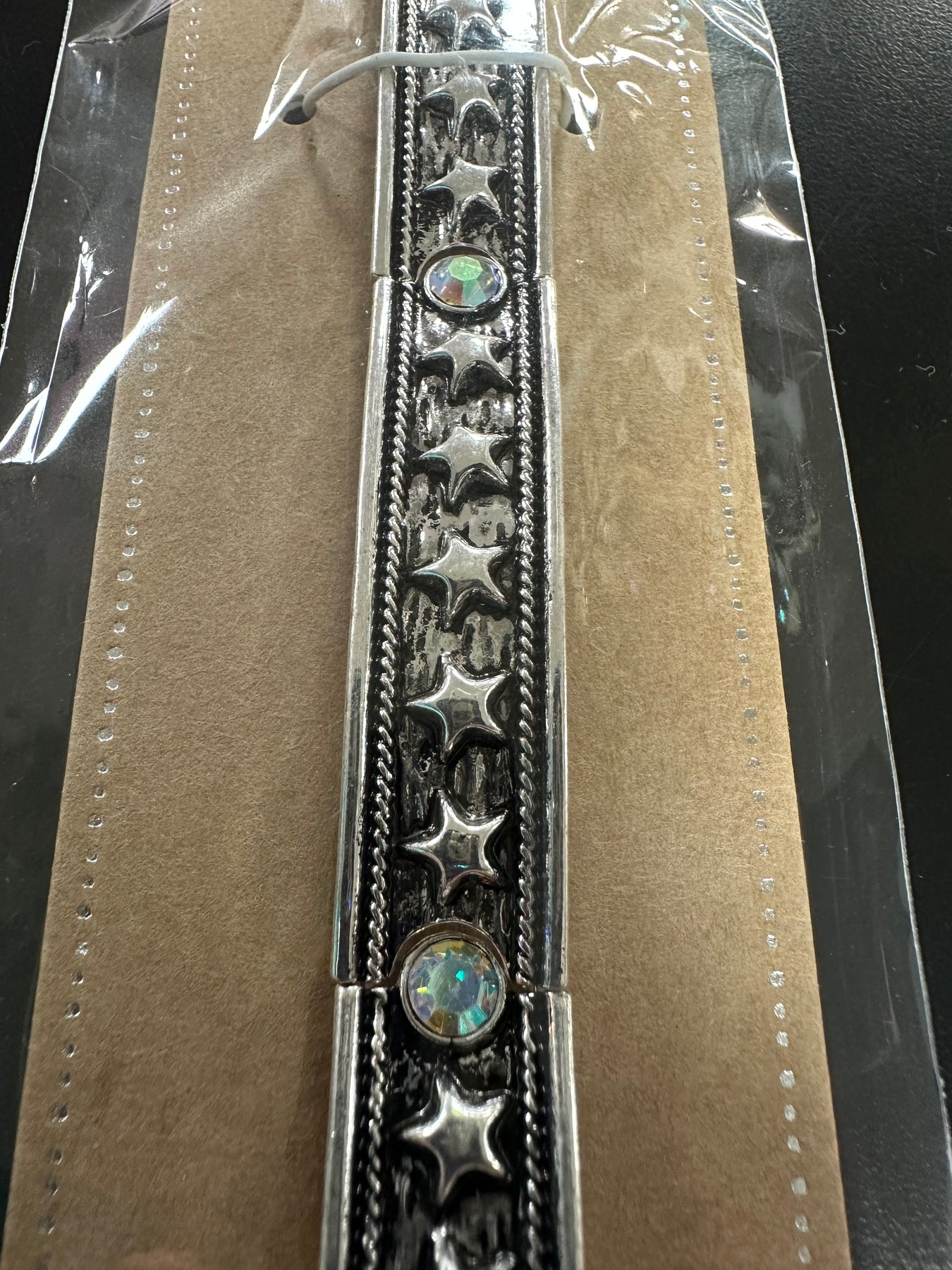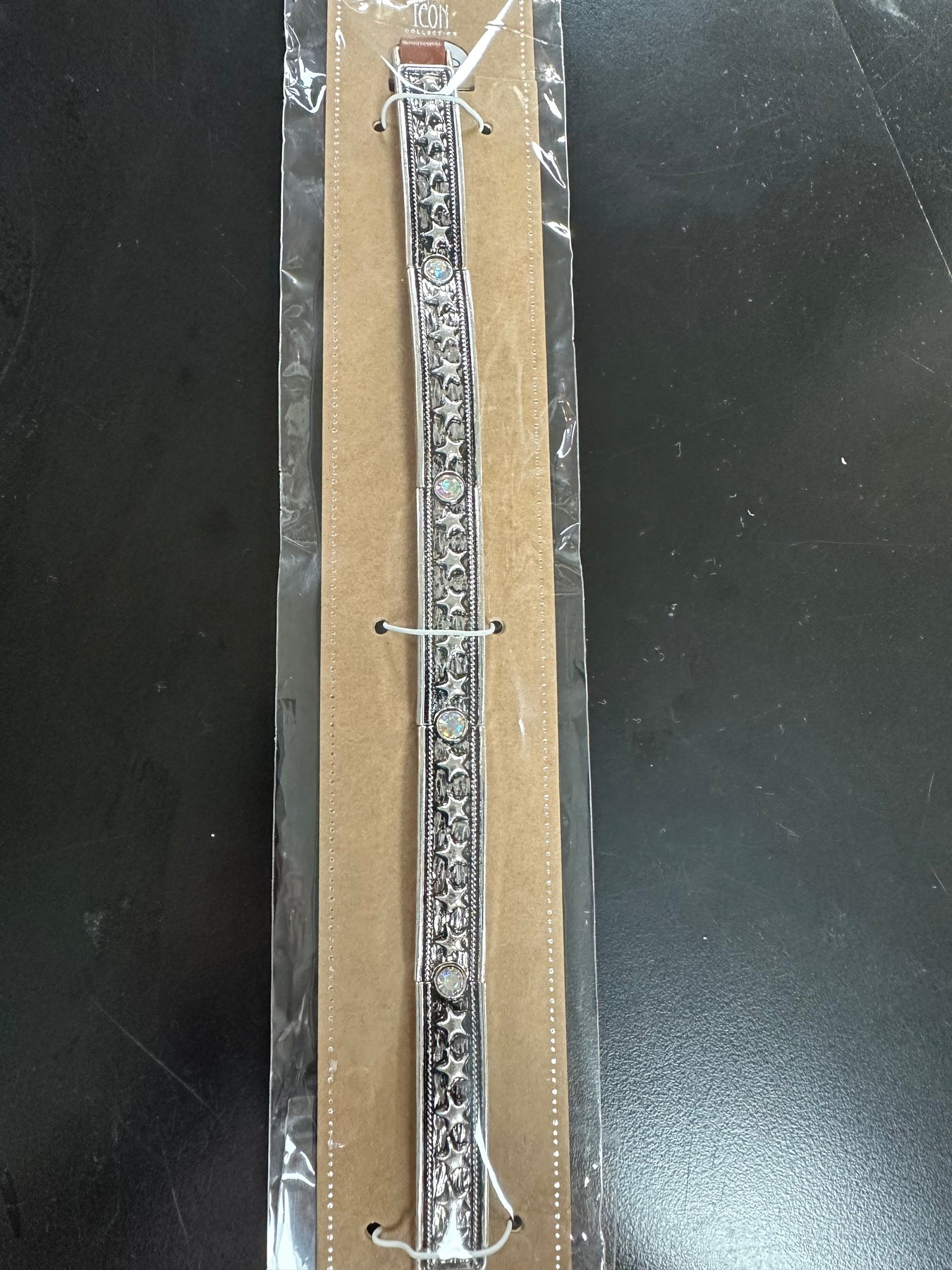 Metal embossed stars and iridescent rhinestones attached to a brown leather strap with a buckle to adjust the fit. This hatband will add piazza to your cowboy hat.