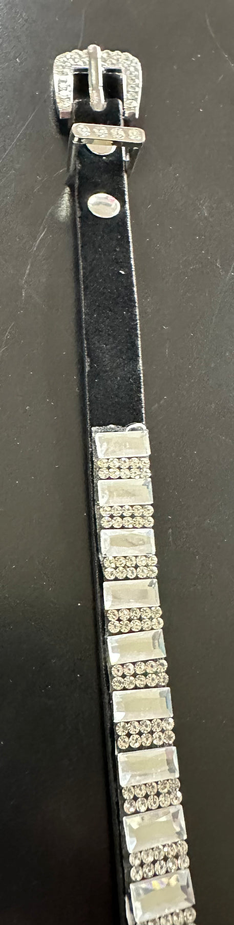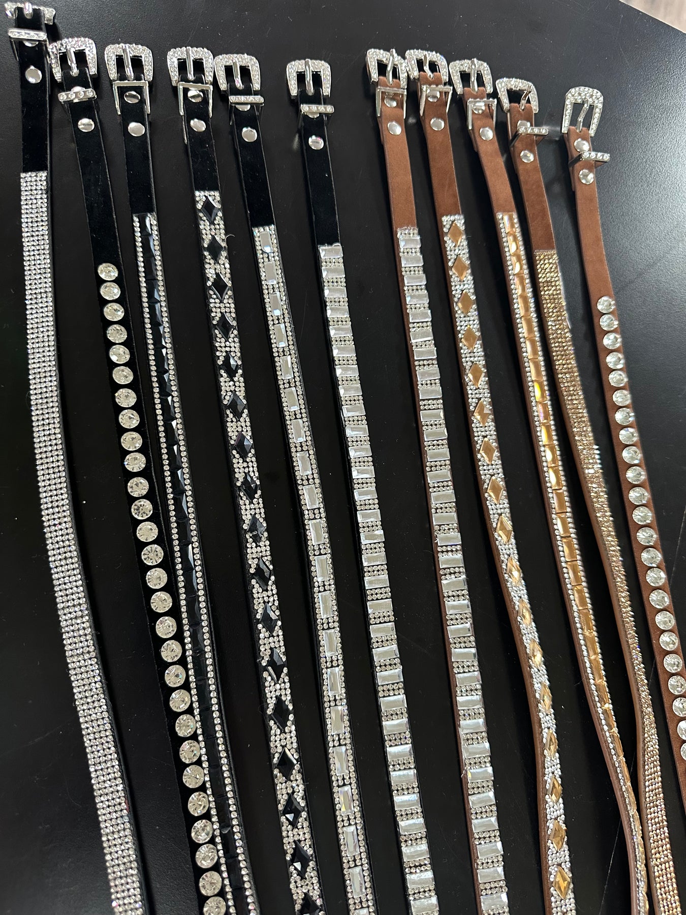 These leather hatbands have a bling buckle to adjust the size. The band is covered in bling.  The leather is in black or brown.  There are several different styles of bling.