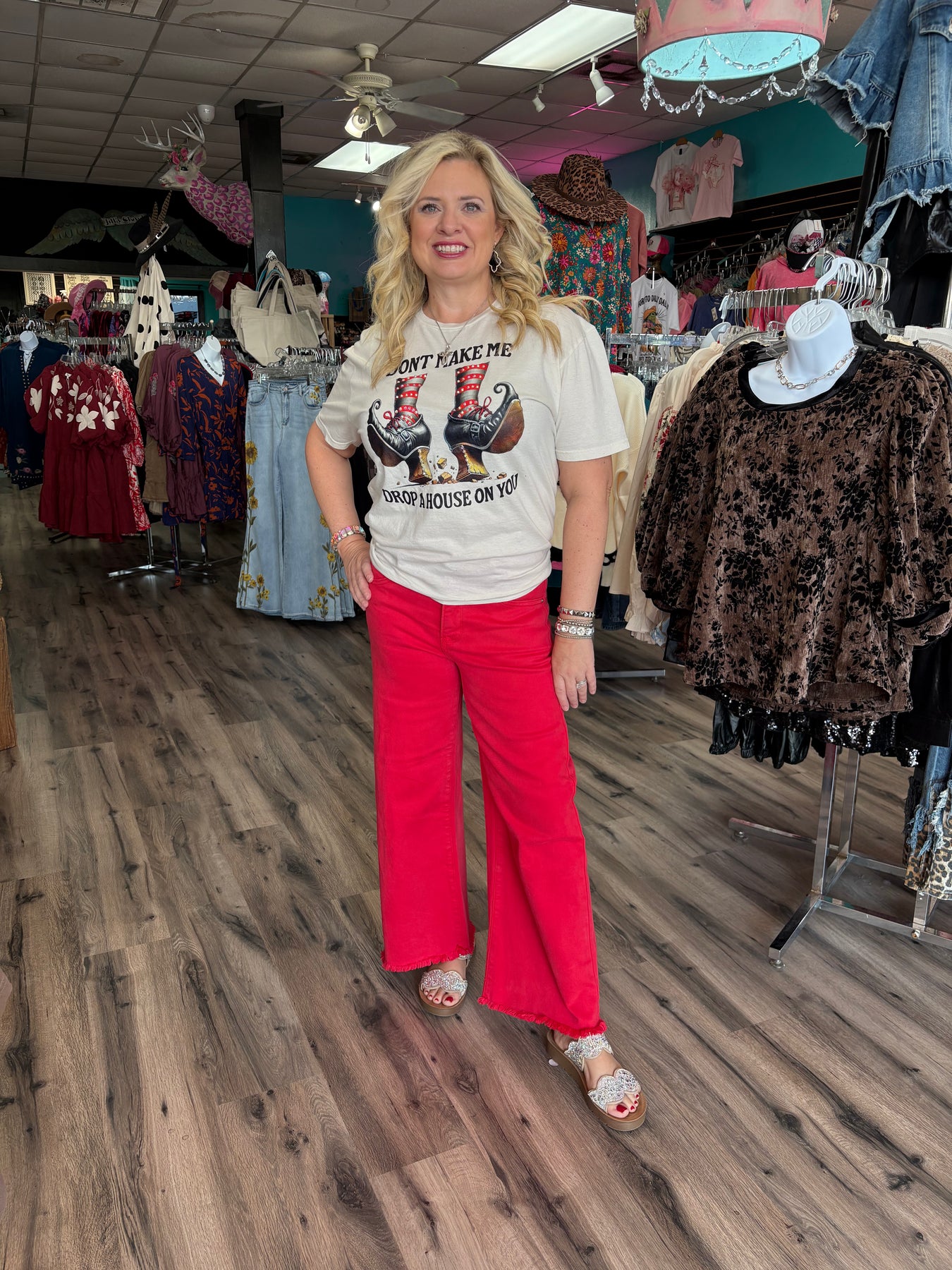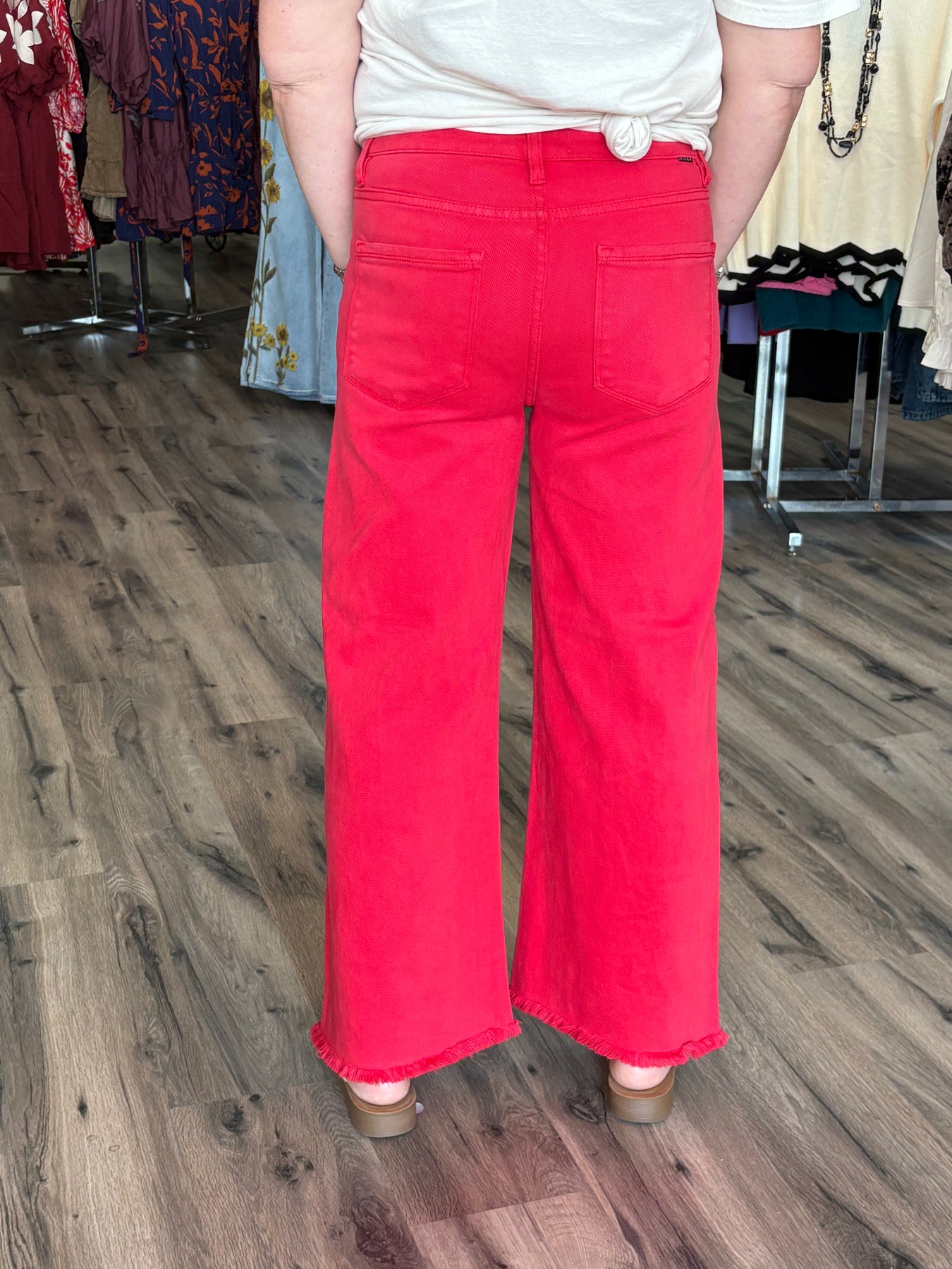 Experience the stunning beauty of Oh Scarlet!! with our Risen High rise crop wide leg jeans. Embrace the bold and passionate vibe of the scarlet color, with frayed ends for added style. Elevate your wardrobe with these must-have jeans today!