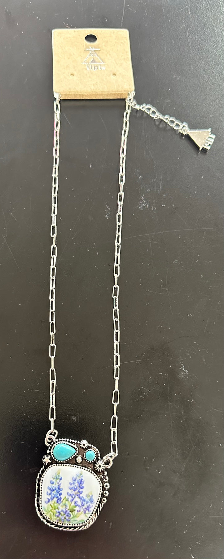 This 16” silver link chain has an oblong ceramic plaque with bluebonnet. It is in a silver bezel with a rope twist around it. There is a teardrop shaped turquoise stone with a flower and beading at the top of the plaque.