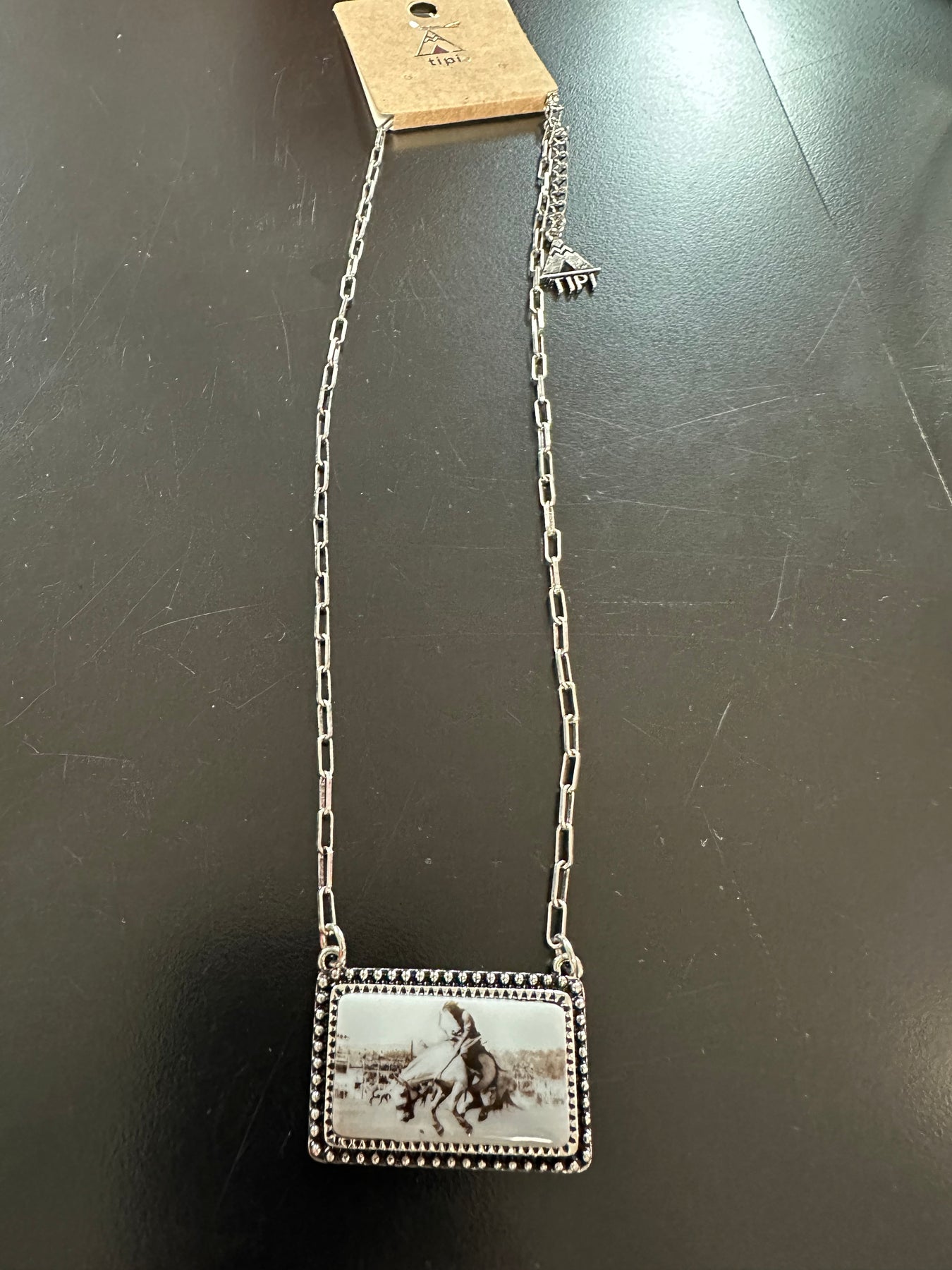 This 16” necklace is a delicate silver link chain with a rectangle ceramic plaque that has a sepia photograph of an actual bronco rider. The plaque is framed in a silver bezel with small beads all the way around.