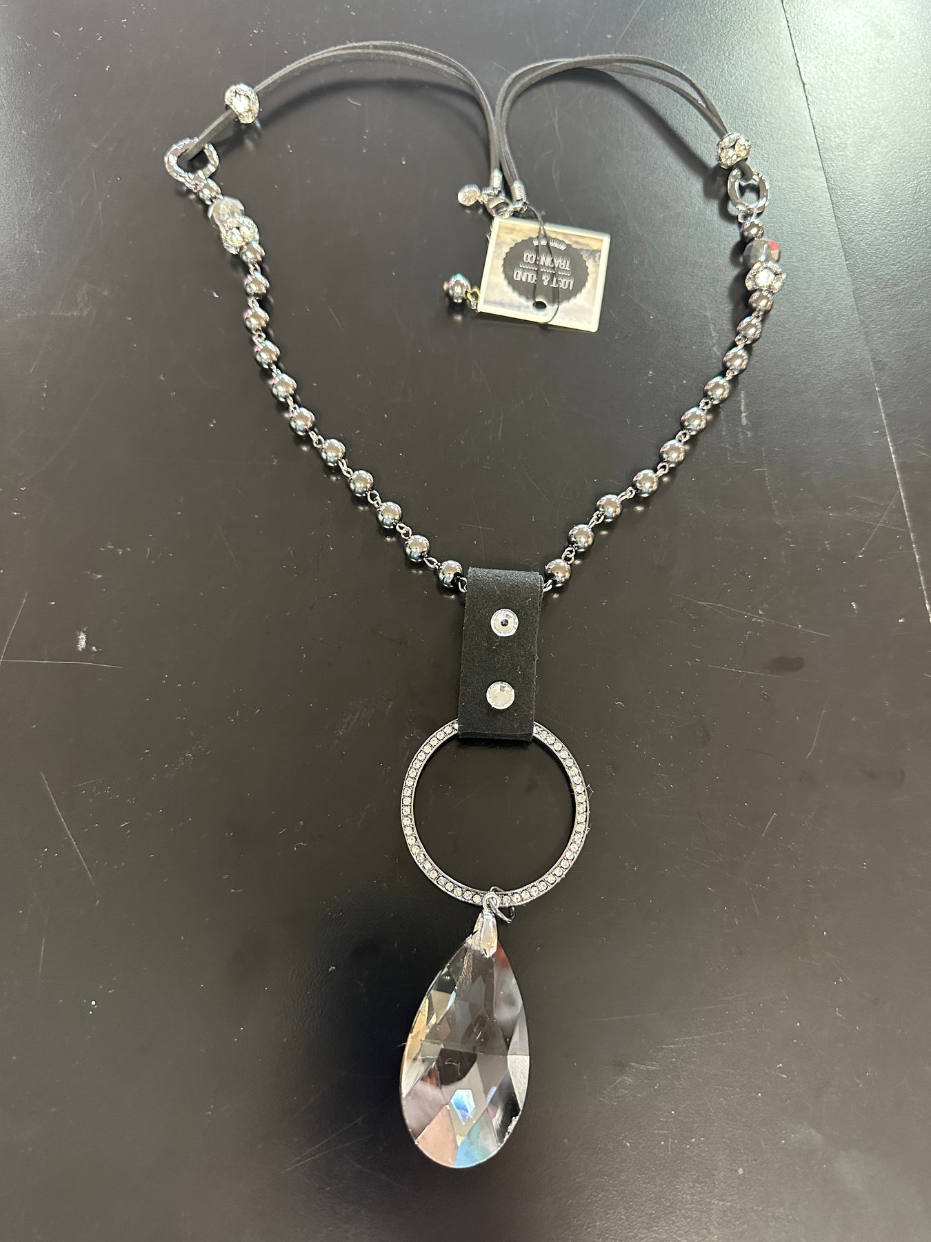 This very long necklace starts with a rawhide double cord, then rhinestone beads, open links, and faceted beads.  The dark gray beads are chained together.  There is a rawhide folded with rhinestones and a ring of rhinestones bed.  From that ring hangs a large faceted teardrop.  The necklace is. 28” long.  The ring and faceted teardrop is 5”.