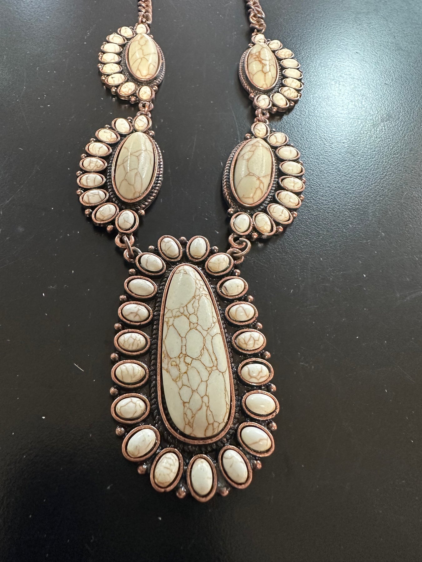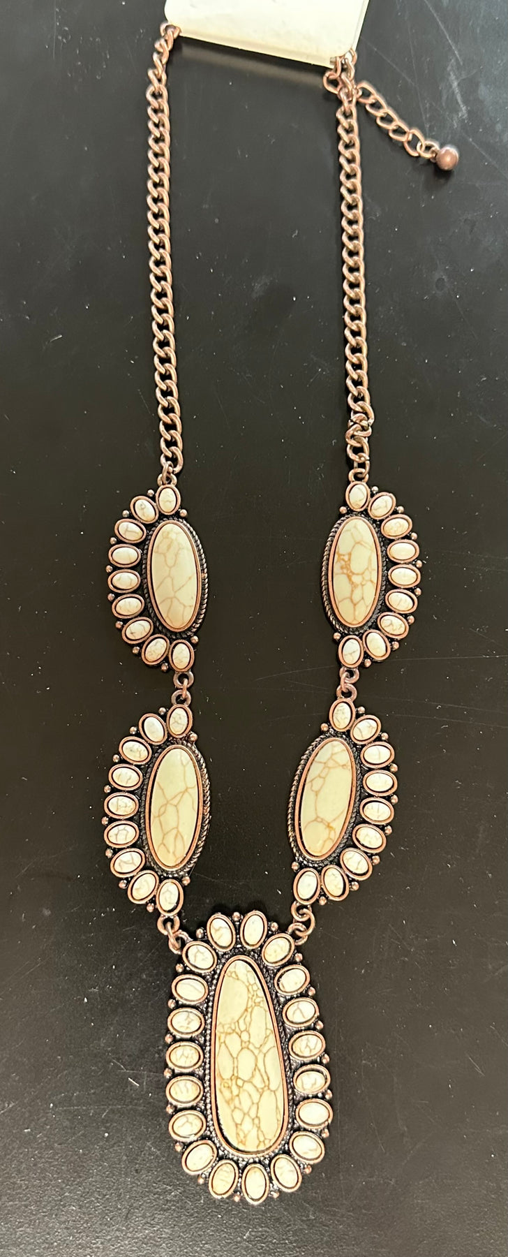 A coppery bronze chain that has oval faux white buffalo stones with small oval stones surrounding on one side of the stone with a center pendant. The necklace is 22”, with an extender chain to adjust the length.
