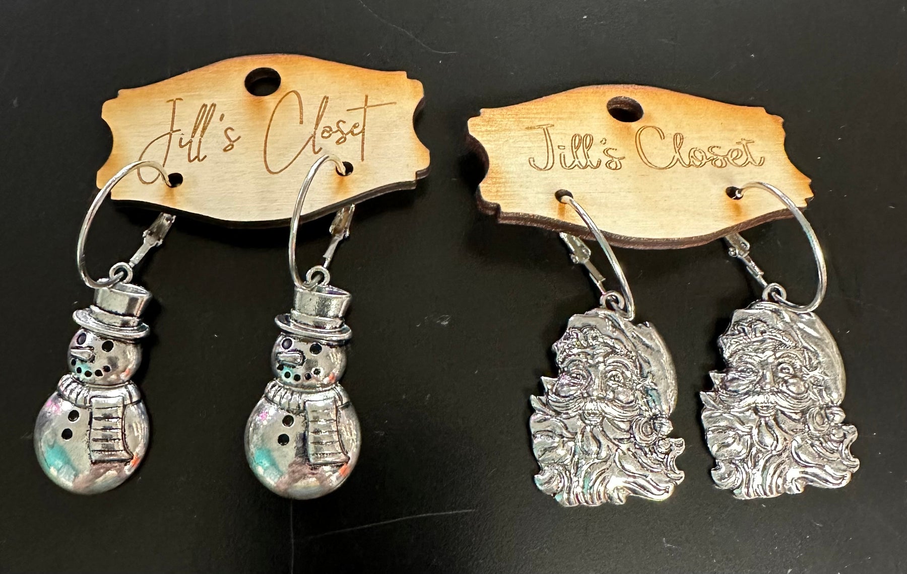 Large pearls in a 16” length with a 2 1/2” silver metal pendant makes a big statement for the Holiday season. We have this available with a Santa face or a Snowman. We have matching bracelets and earrings.