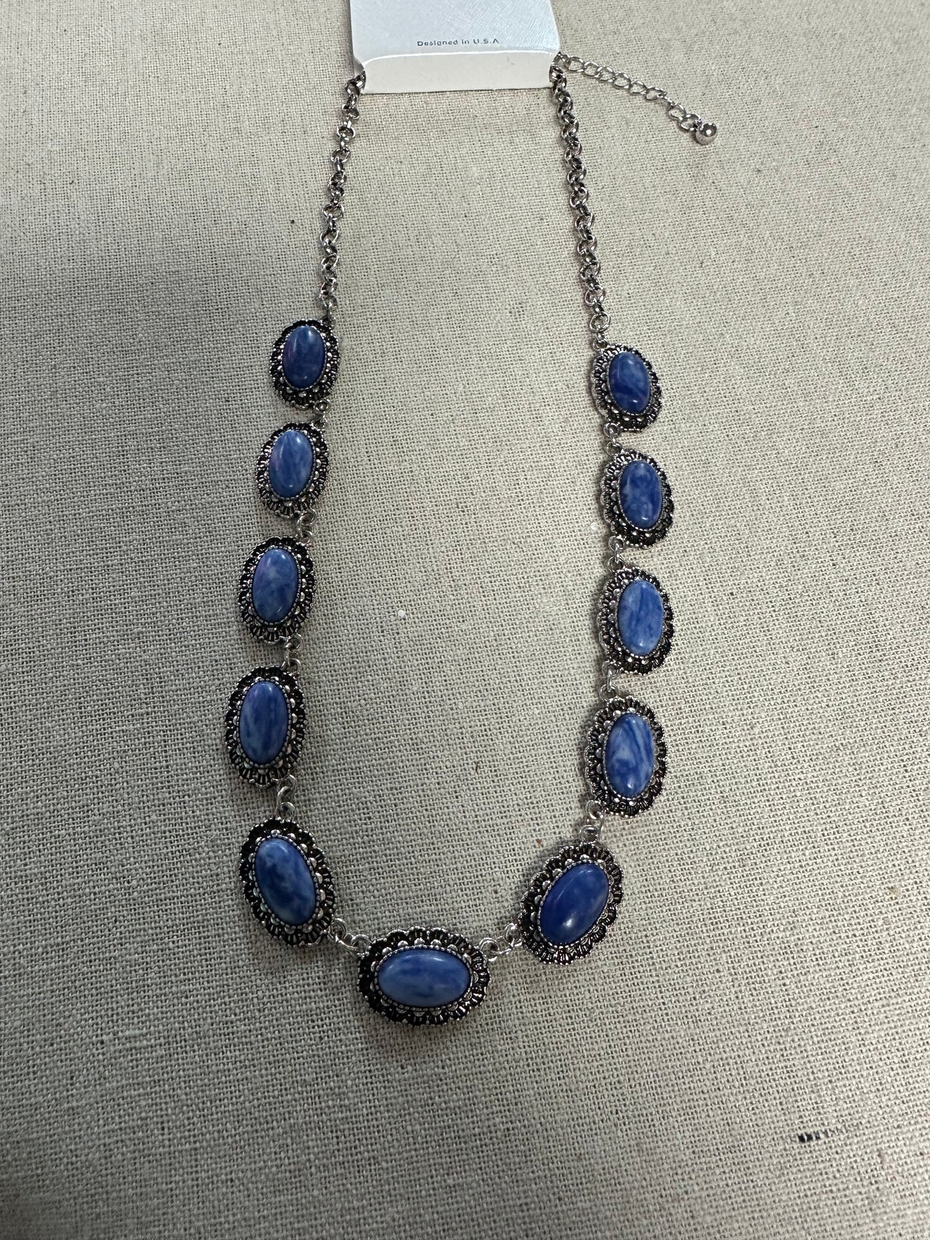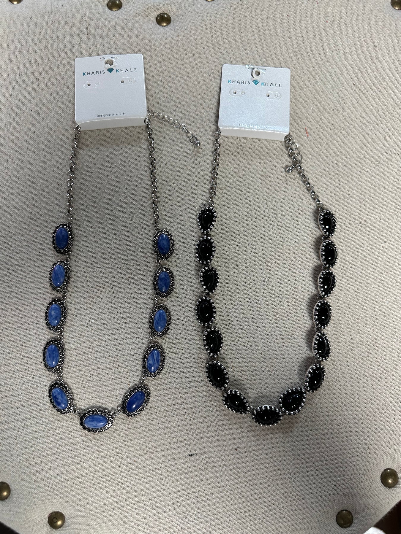 This necklace features a chain link for the back of the neck, then in the front is a colored stone surrounded by a silver bezel. The necklace measures 18” with an extender. You can choose from a blue stone or a black one.