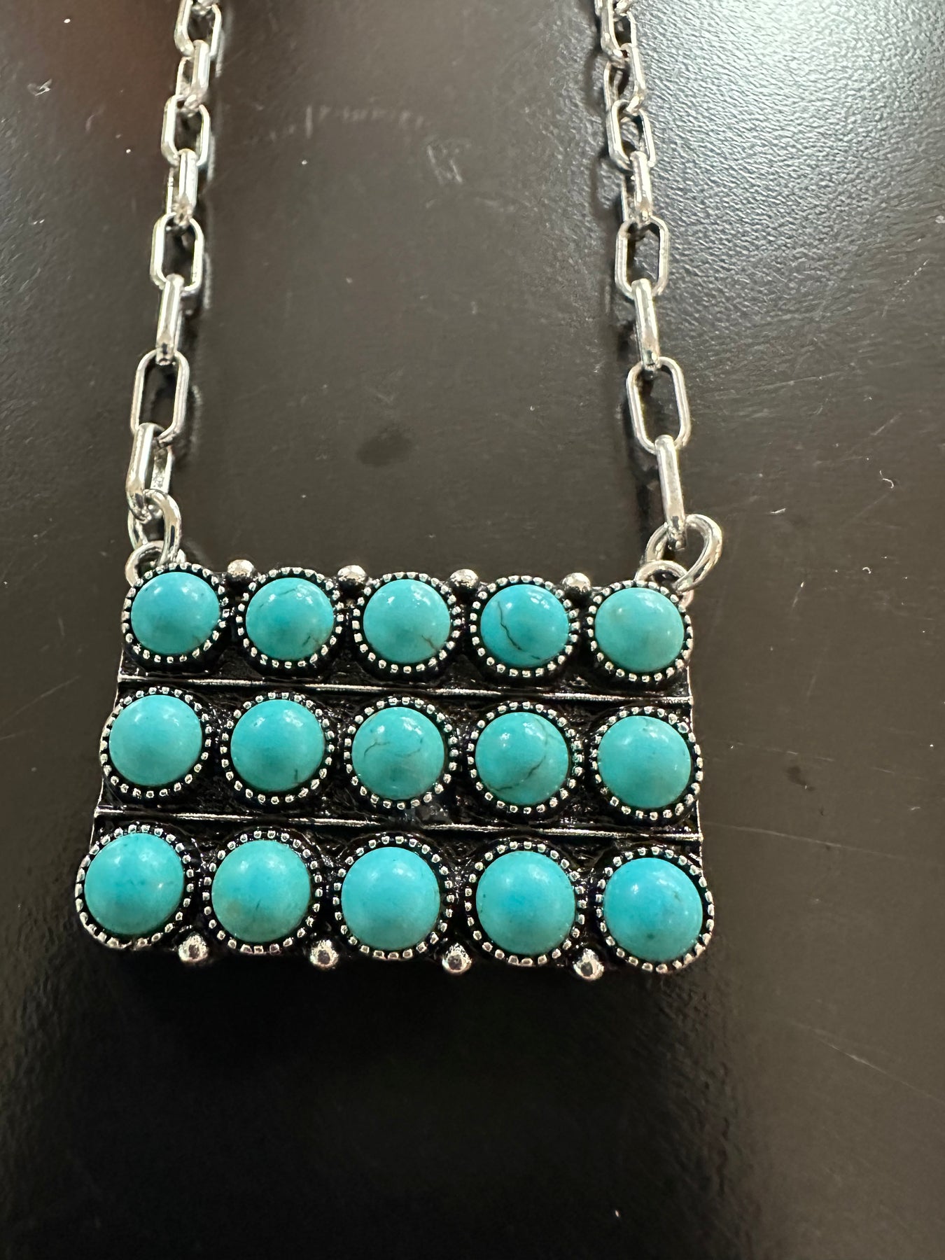 This oval silver link necklace is 15” long, plus the extender makes it the perfect link for you.  The silver rectangle is 1 1/2” wide x 1” long. You can choose from all silver or turquoise balls.