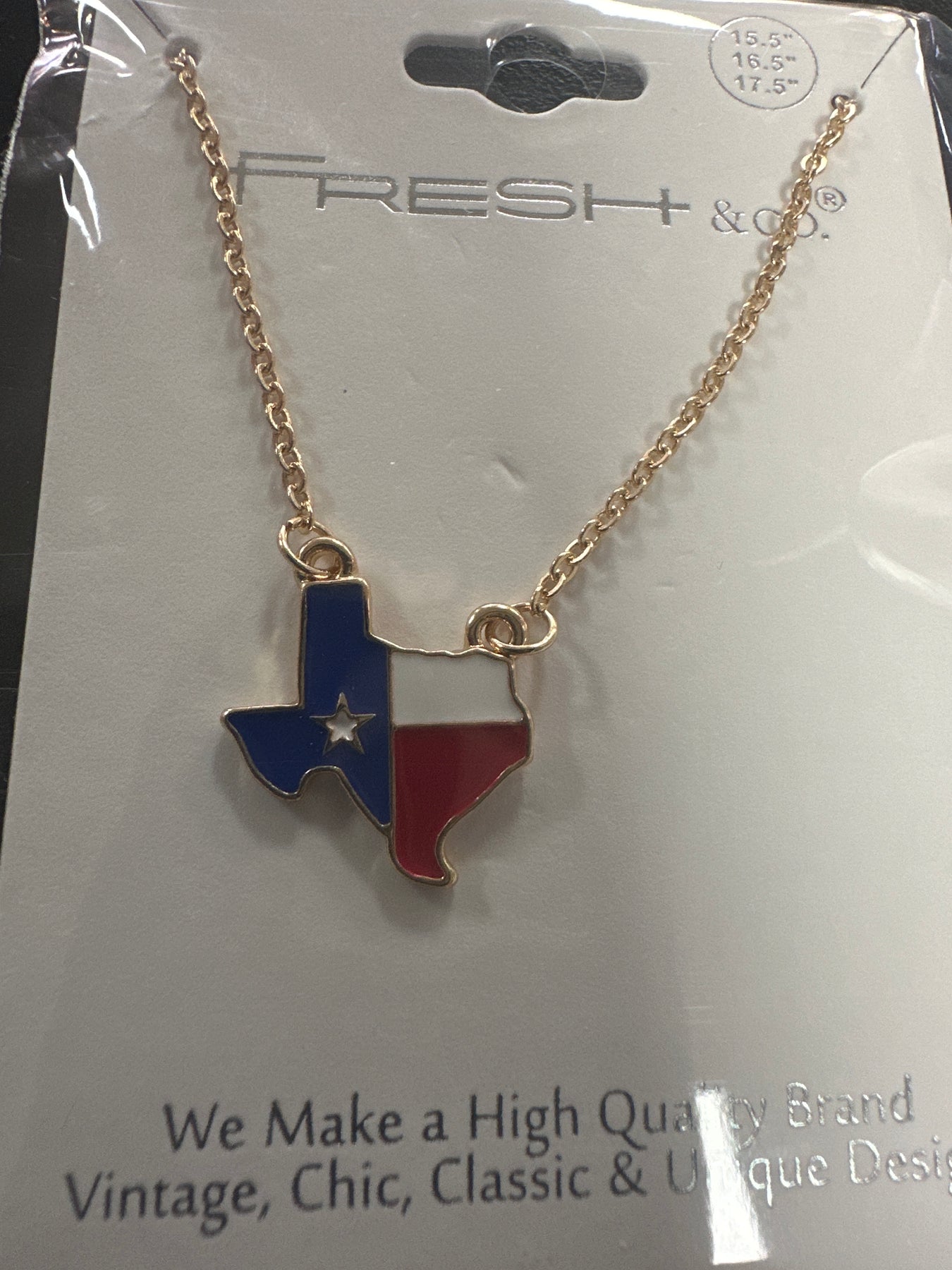 Show your Texas pride with these acrylic bow State of Texas Drop Necklace. Available in Silver, Turquoise, Maroon or Black glittery post with a thin gold chain.