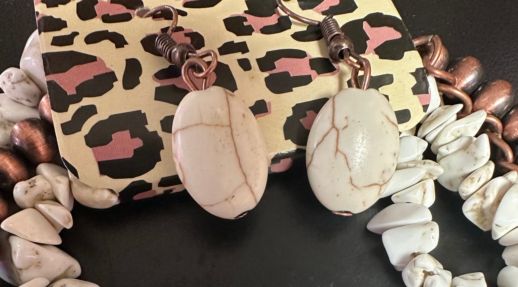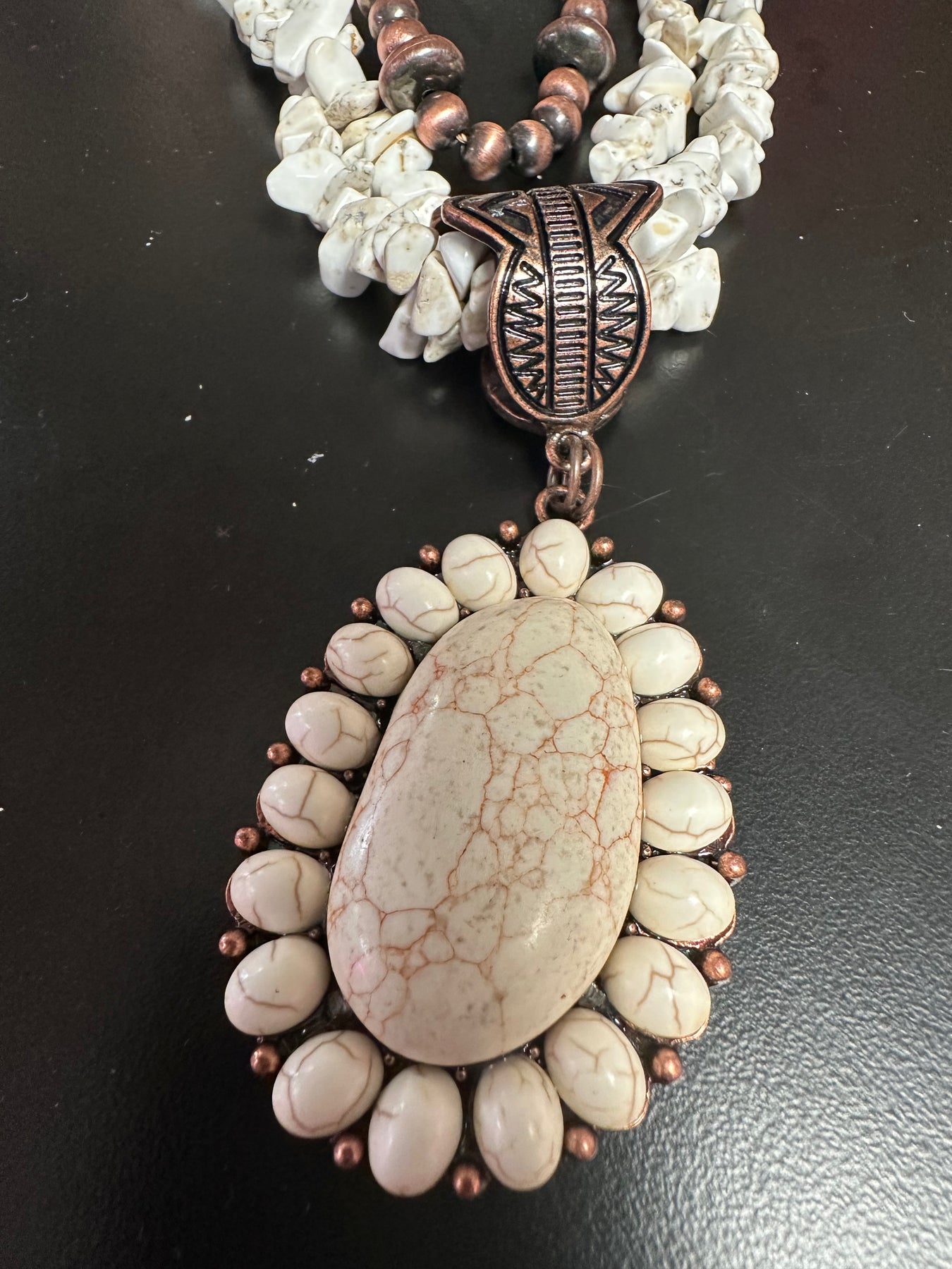This triple standard necklace has two strands of chip turquoise and one strand of faux Navajo pearls. The pendant is a large oval faux turquoise stone surrounded by smaller oval stones. There are oval stone drop earrings on a silver toned fish hook. The necklaces 18”. We have this necklace in a turquoise blue with silver, so a white buffalo faux turquoise with bronze.