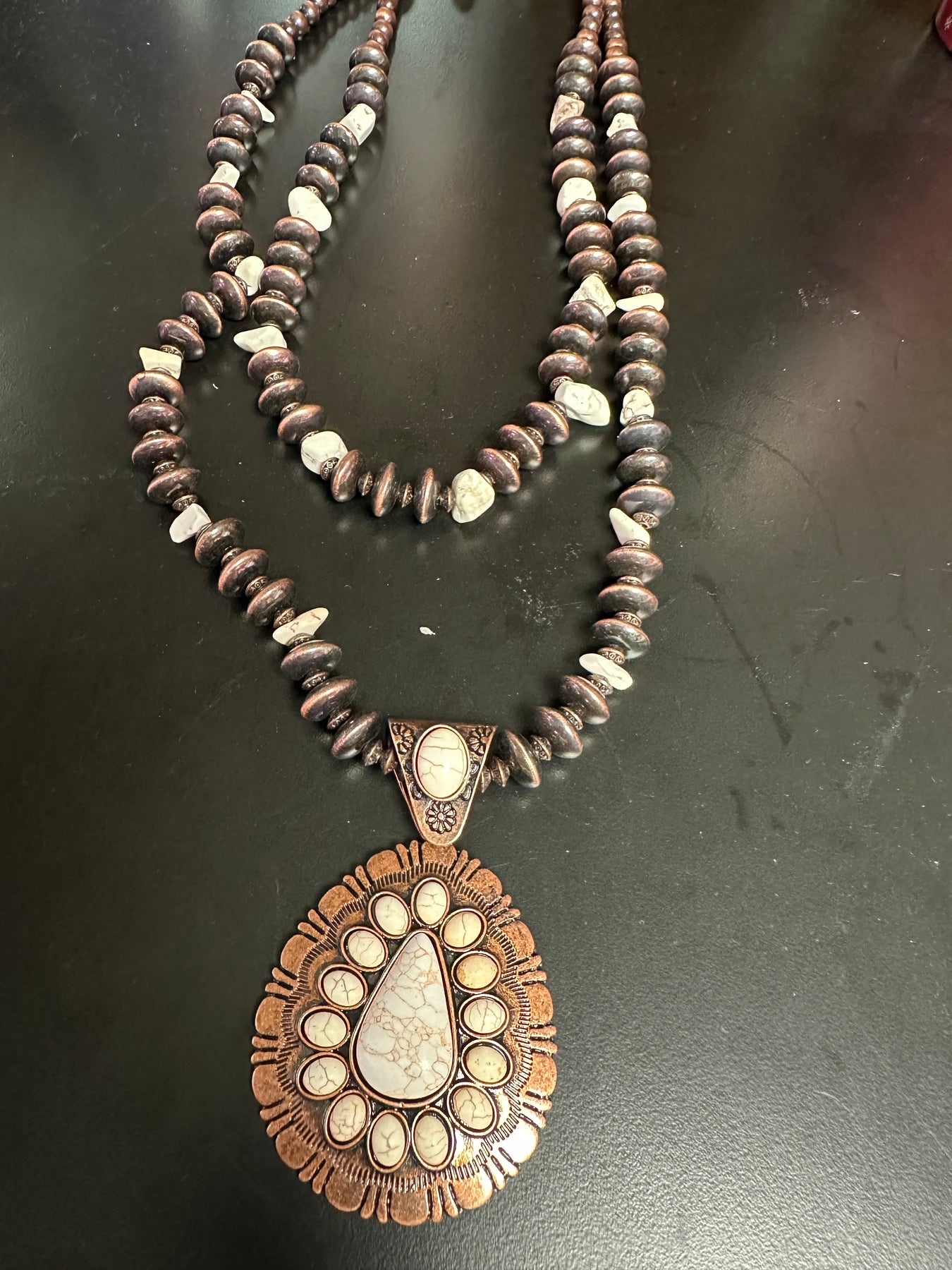 This very long double strand coppery bronze beaded necklace has white buffalo turquoise stones every 3 large disk beads. The pendant has a triangle shaped stone surrounded with oval stones. There are matching ball earrings that hang from a fish hook. The necklace is 18”.
