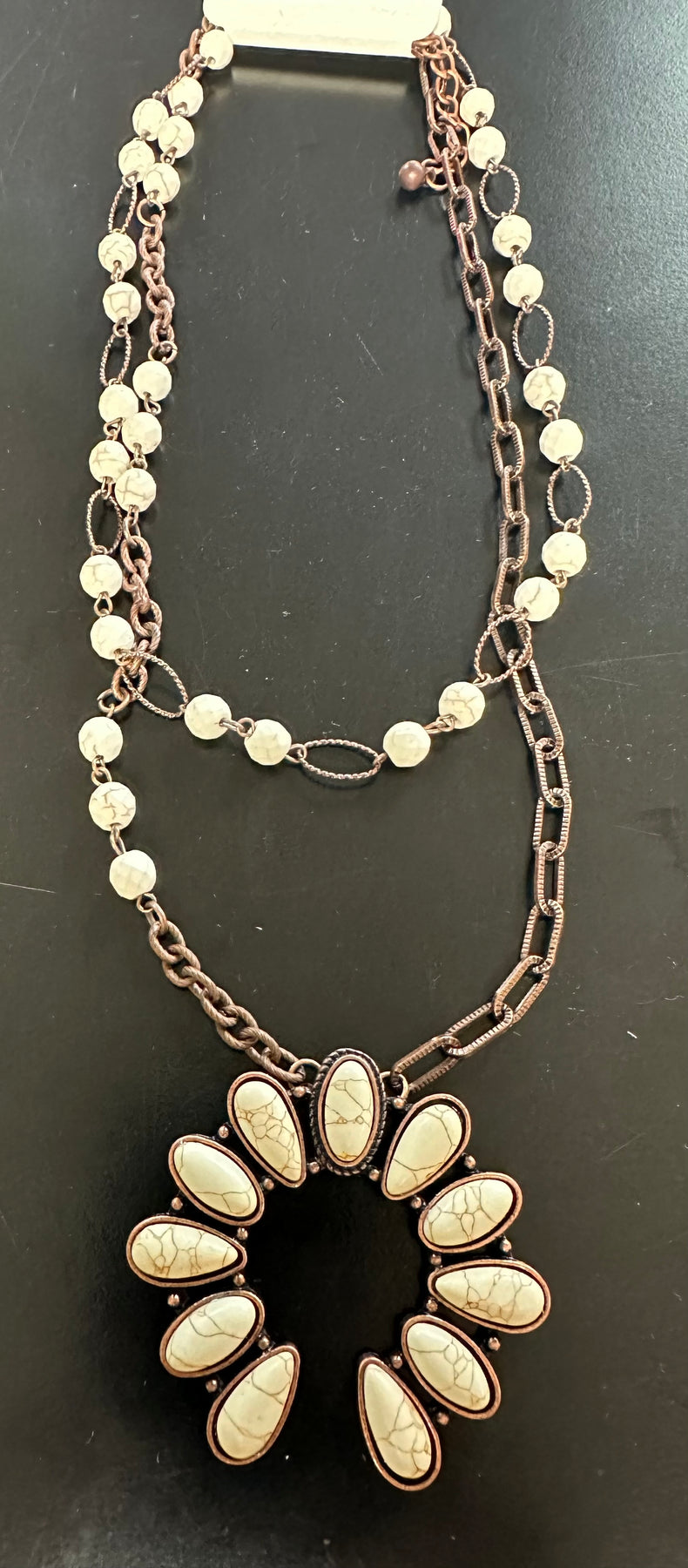 This faux white buffalo turquoise necklace has a double layer of bronze link chain and faux white buffalo stones. The pendant Naja is faux white buffalo turquoise set in a bronze bezel. The large bronze link chain is between the faux white buffalo beads. This double strand necklace is 18” in length. There is an extender chain to help adjust the length.