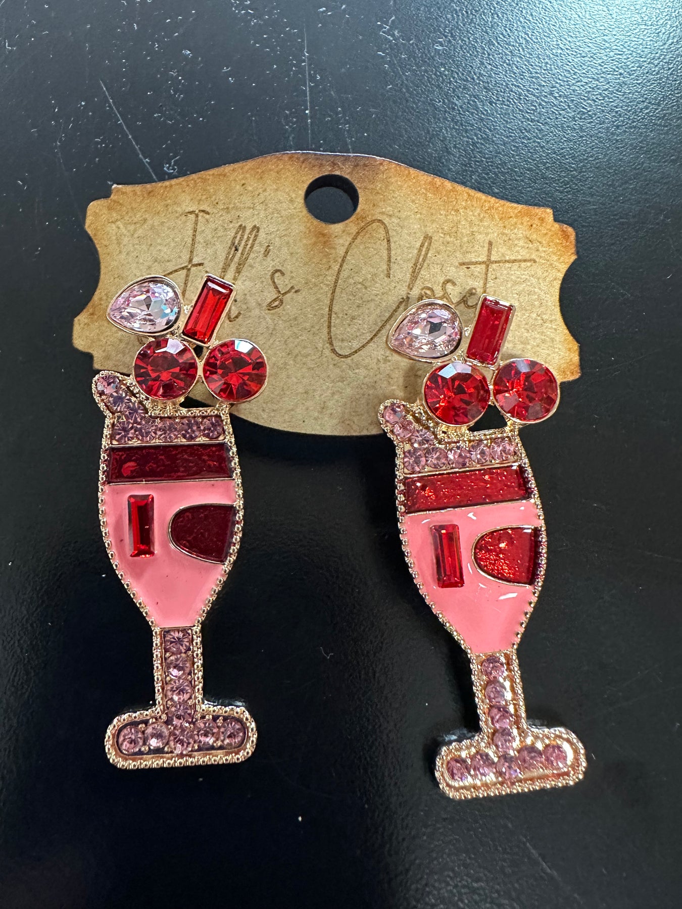 These wire cocktail glasses are filled with pearls and stones to simulate a bubbly cocktail glasses hanging from a faux pearl stud. These glasses measure 2” in length. Look at the photos for the different color combinations. We have Green, Pink, red, blue/pink and multi-colors.