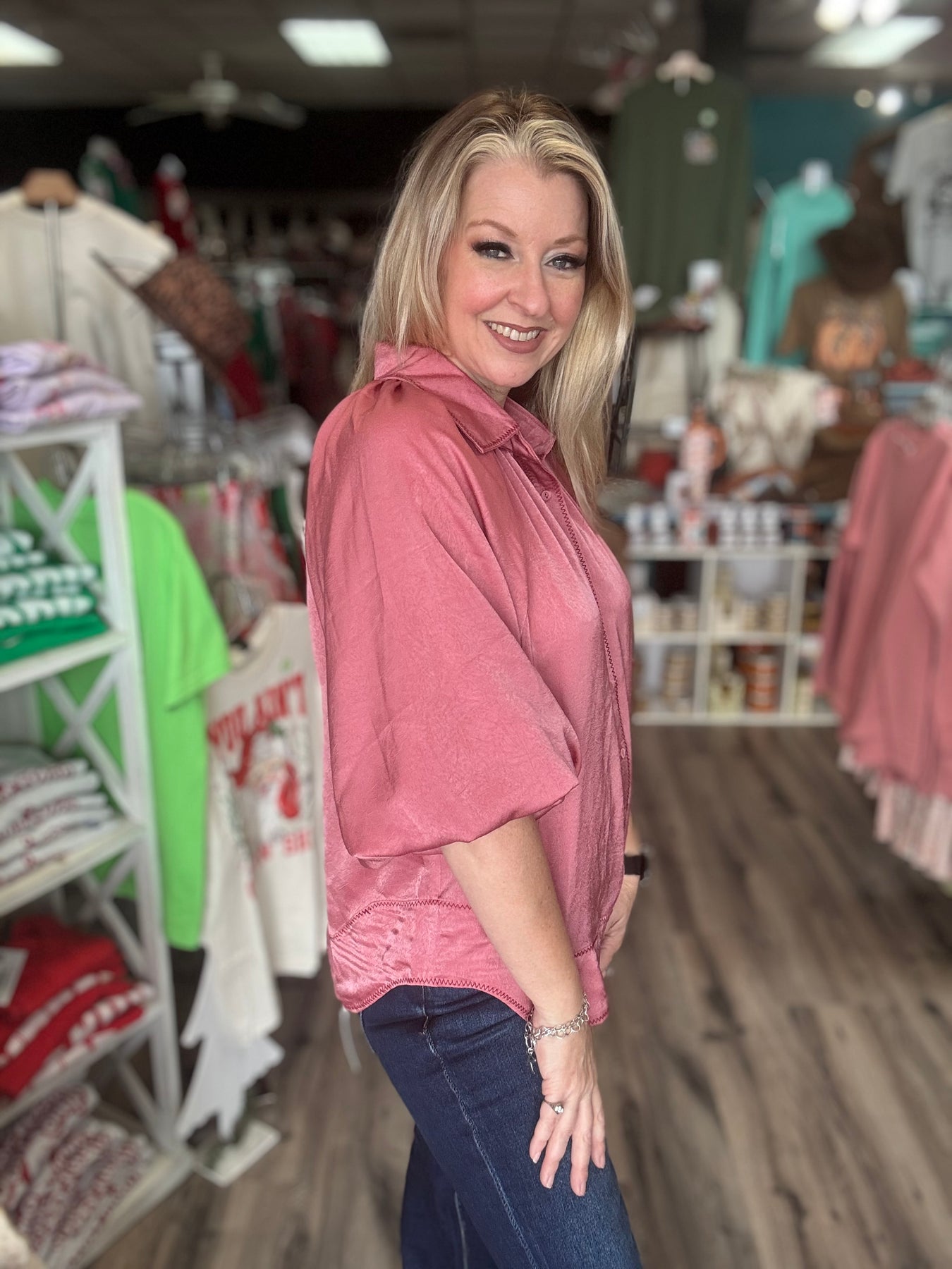 This buttondown top is stunning and so soft. Sueded satin with contrasting stitching. A flowy fit with 3/4 sleeves. available in S-M-L. Oversized and you can size down.