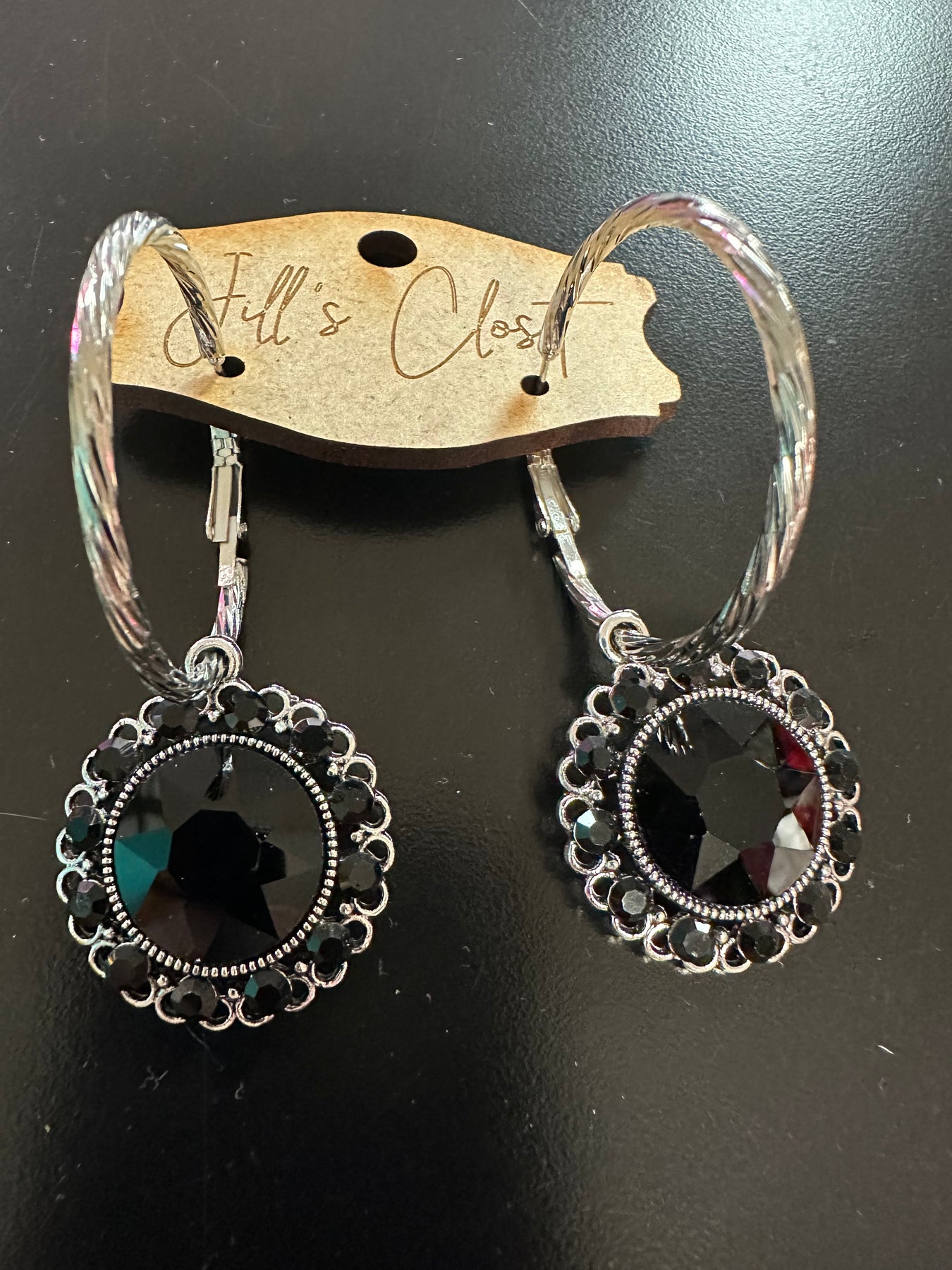 These large silver toned twisted hoops have a big faceted jewel surrounded by rhinestone. These earrings hoop measures 1 1/2” across. The jewel is available in clear, red, purple or black. It measures 1 1/4” across. These earrings will attract much interest.