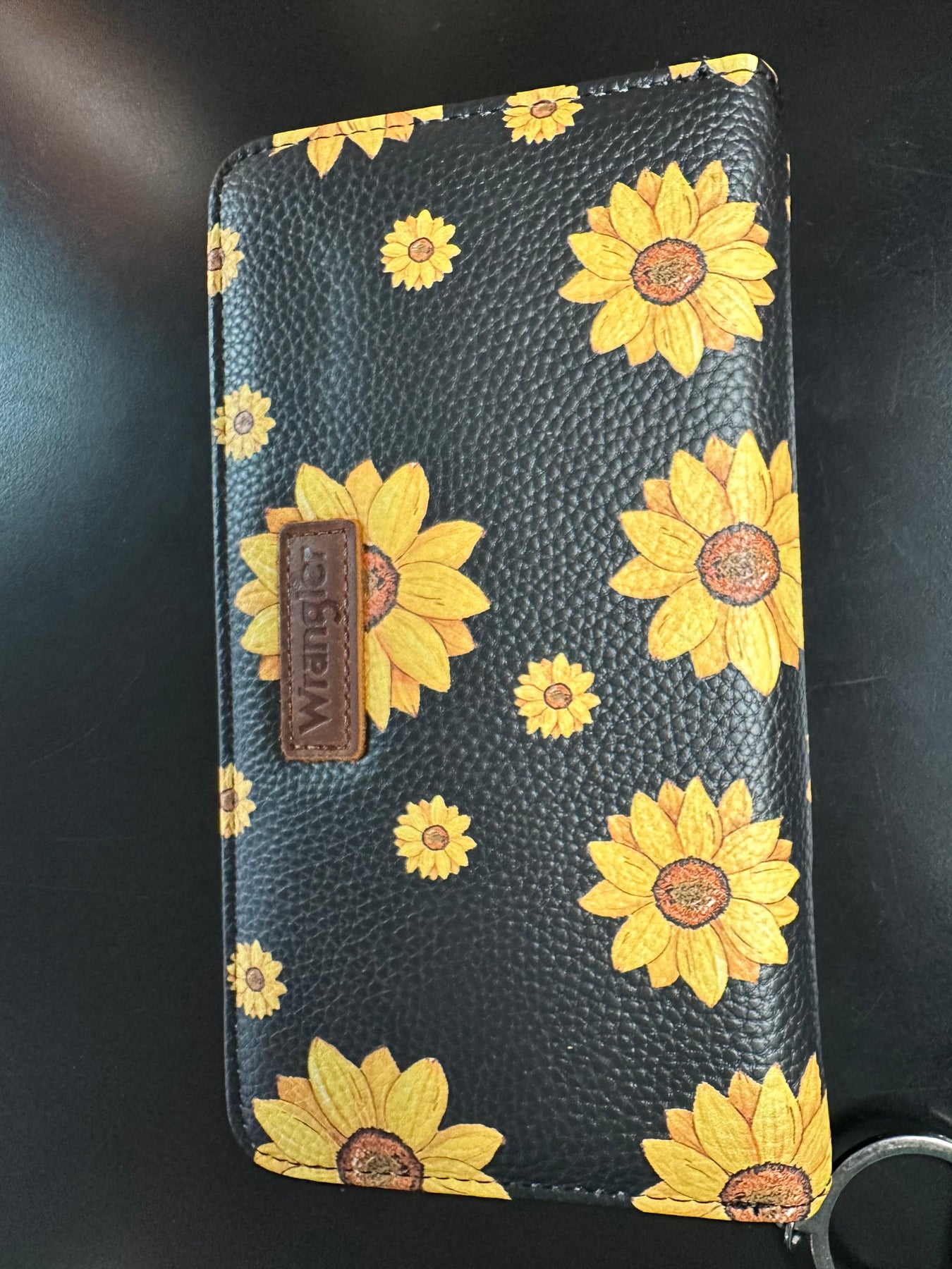Wrangler faux leather printed with sunflowers.  The wrist strap is a printed canvas.  The zipper has a large ring. Inside is slots for your cards, a zipper pouch and compartment.  This wristlet measures 8” X 4.5”.  This wristlet is available in Brown, black, cream and pink.