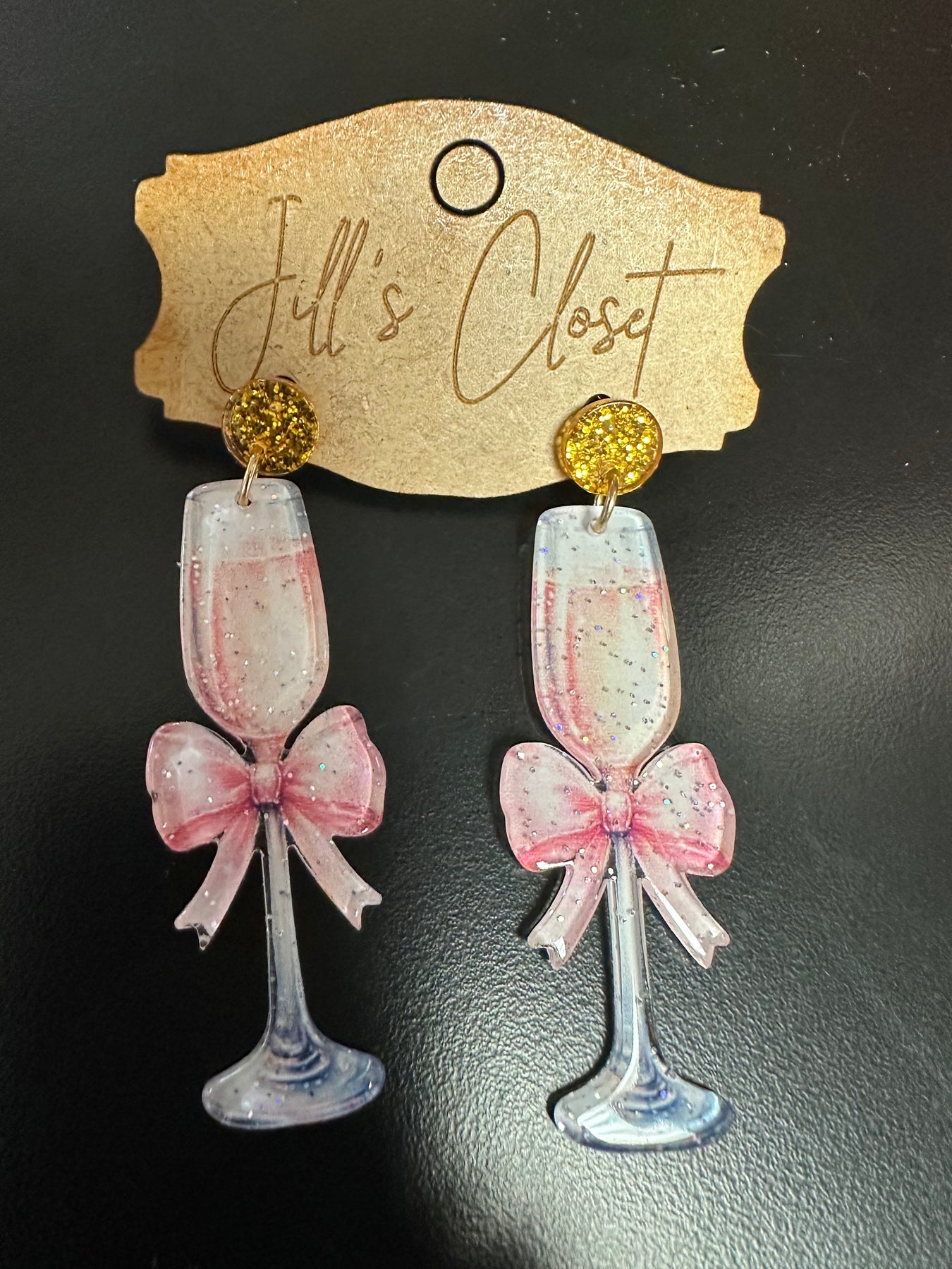 Champagne Flute earrings in pink or black. Celebrate any occasion, weddings, showers, New Years, etc. these acrylic earrings are very lightweight. The black champagne flutes hang from a golden fish hook. They are 2” in length. The pink champagne flutes are hanging from a golden glitter stud. They measure 2” in length.