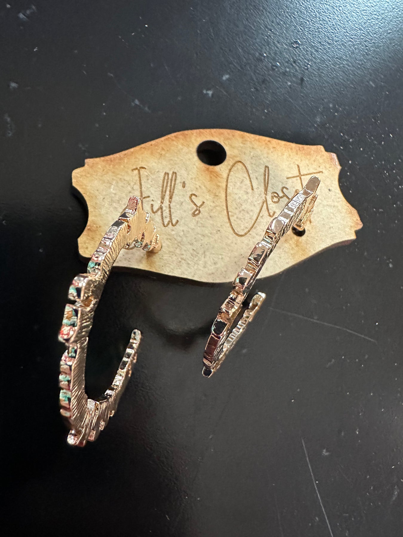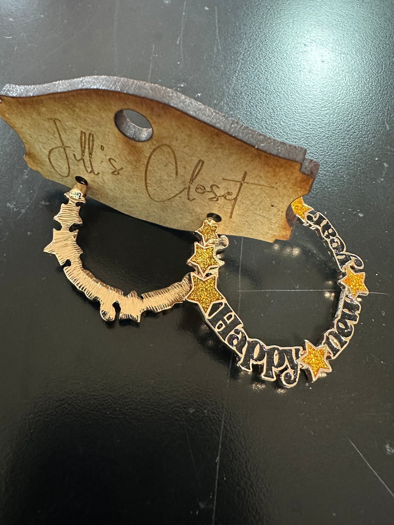 These gold toned hoop earrings have a stud back. The enamel says Happy New Year with Stars in black & gold.