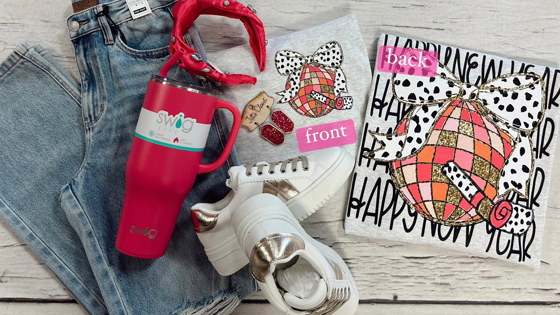 This long sleeved Heather gray tee has a bright colored disco ball and Happy New Year repeatedly printed on the back of the shirt.  Then there is another small disco ball graphic printed on the left chest in the front.  You can celebrate going and coming.  This tee is available S-3XL.