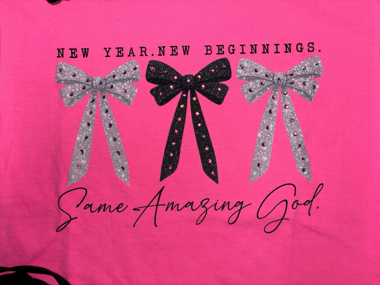 This neon pink Comfort Colors short sleeved tee has the perfect Nee Years sentiment….”New Years, New Beginnings, Same Amazing God”. The shirt has added rhinestones for extra sparkle. There are 3 bows in the center that are faux sparkling glitter. This tee is available in S-2XL.