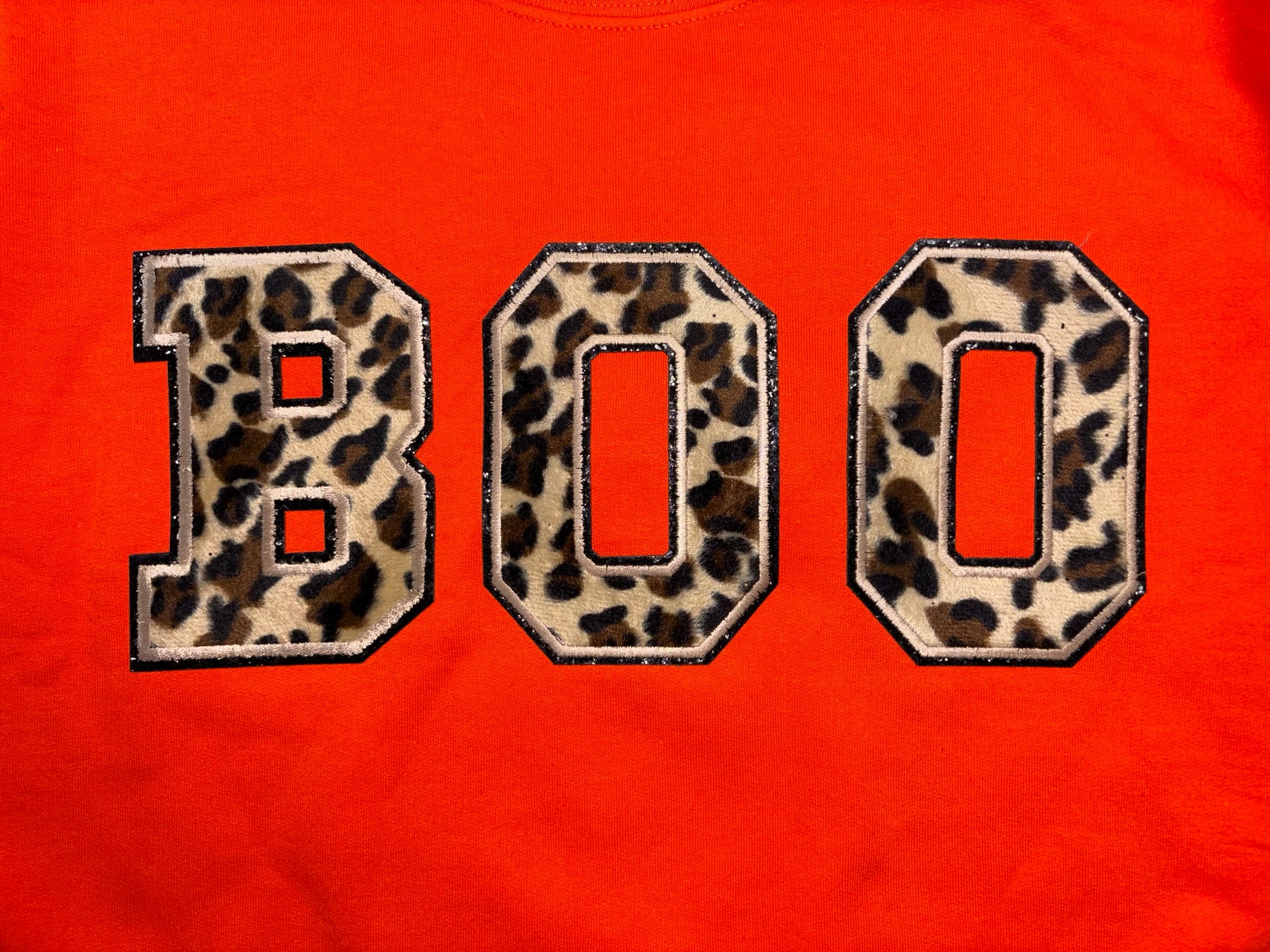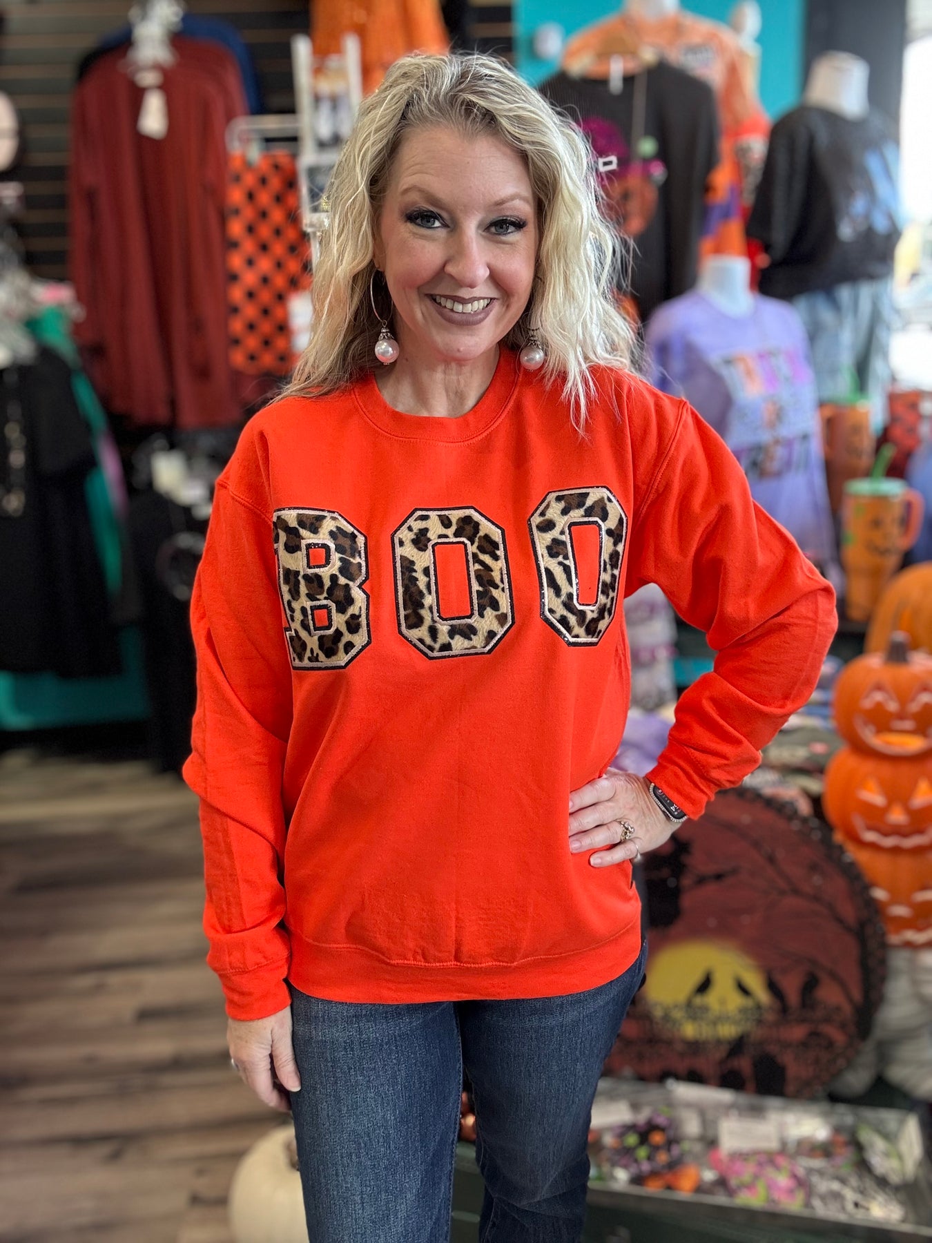 What says Halloween more than a bright orange sweatshirt with the plus leopard BOO letters? This sweatshirt is available in S-2XL.