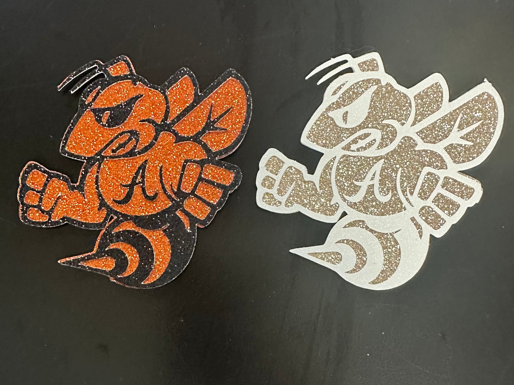 These diecut are two layers of cardstock, one of glitter. These cutouts can be used on Homecoming mums, or other decorative uses. The Sting is 4”. They are in black and orange glitter, or white and gold glitter.