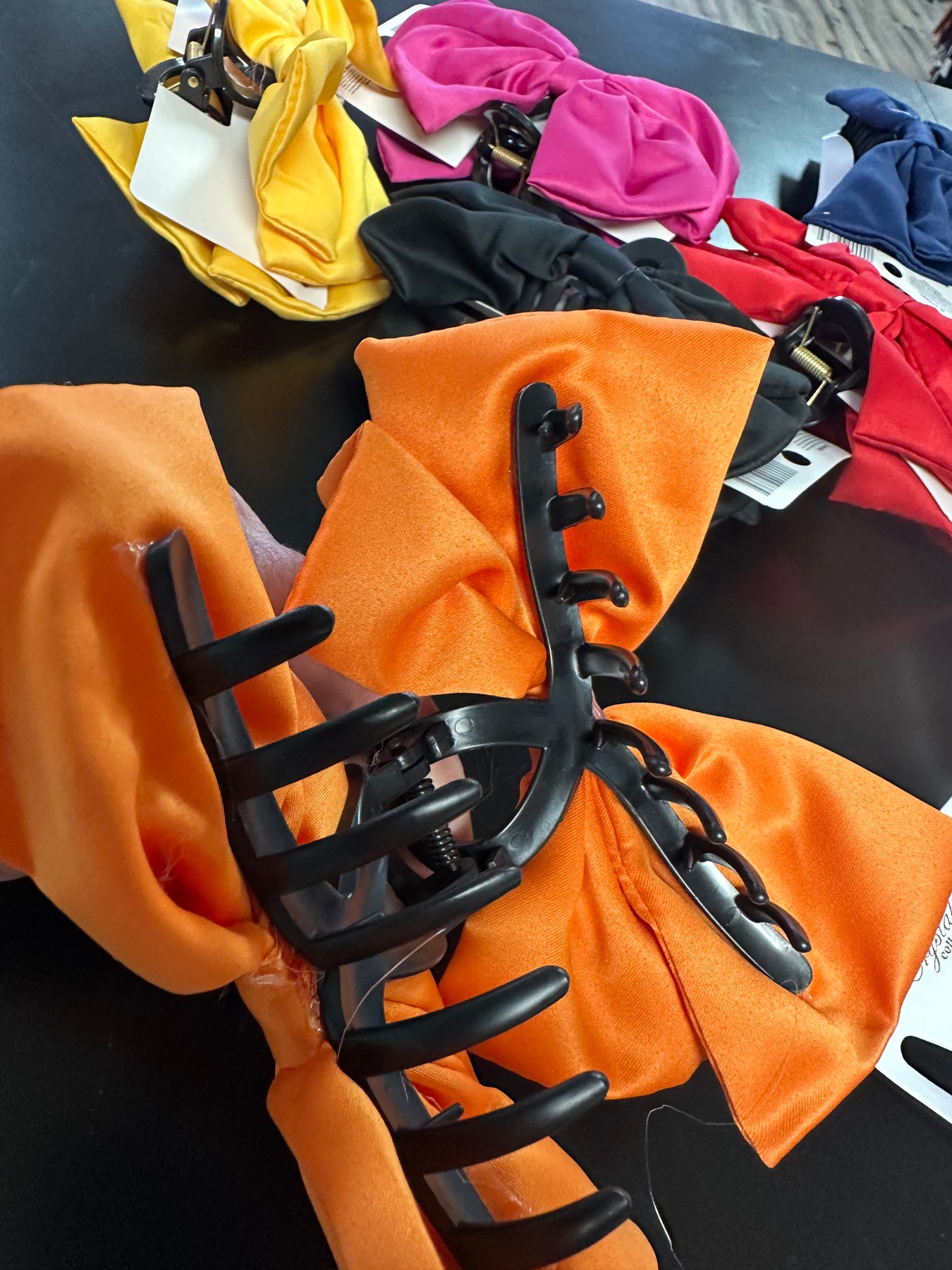 Large 6” satin hair bow on both sides of a claw clip.  Multicolors available.